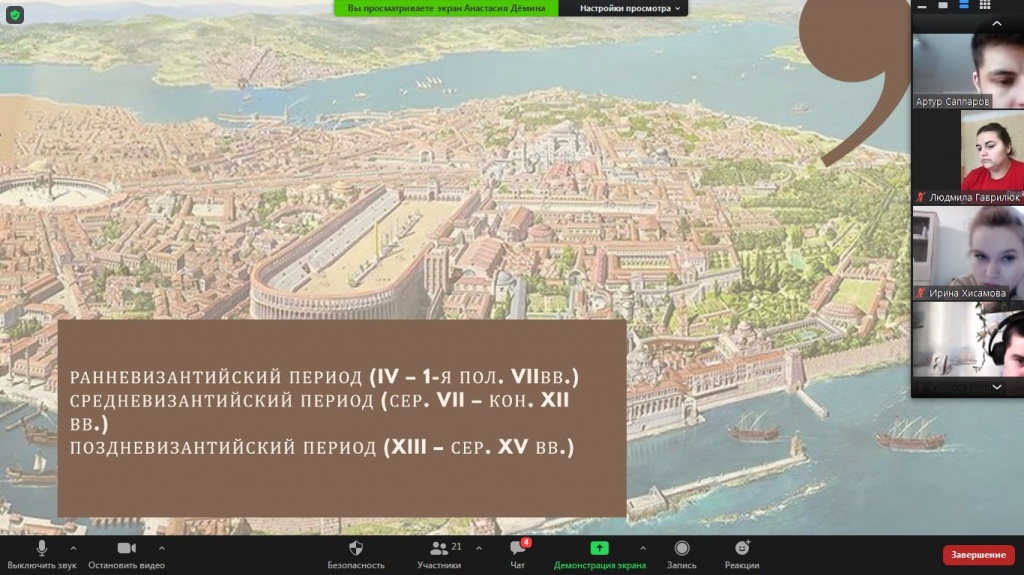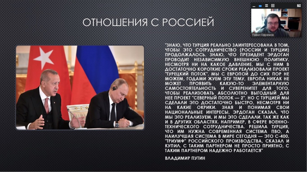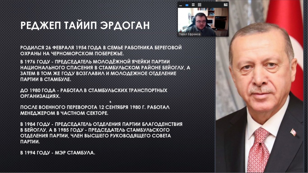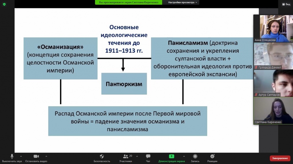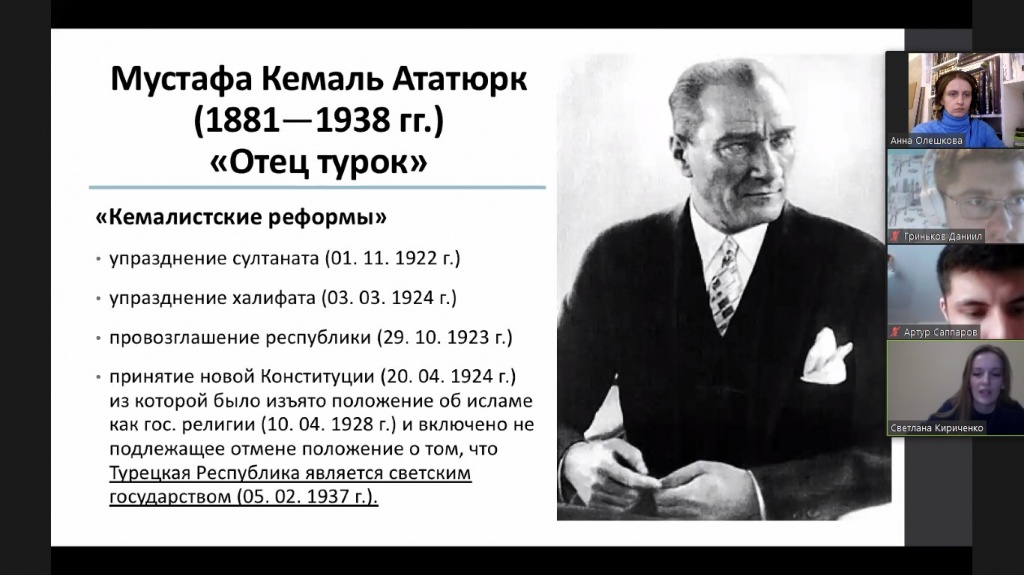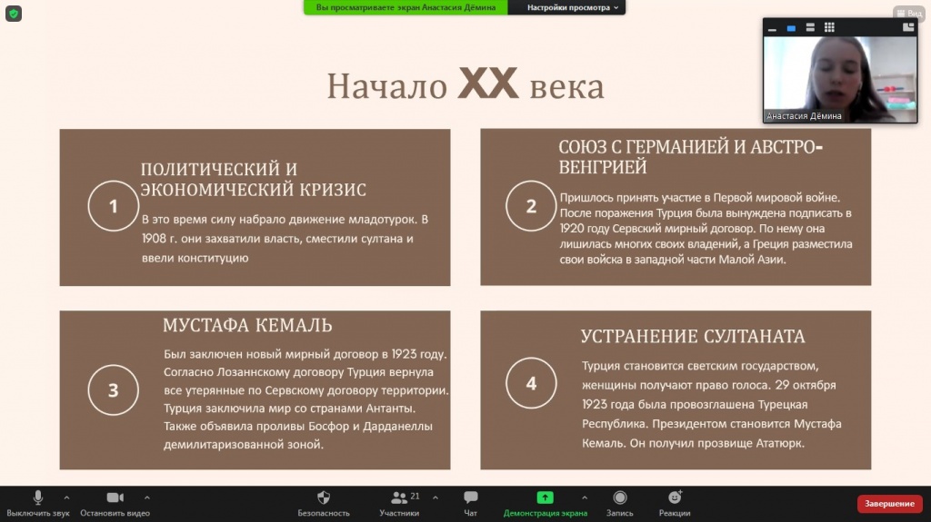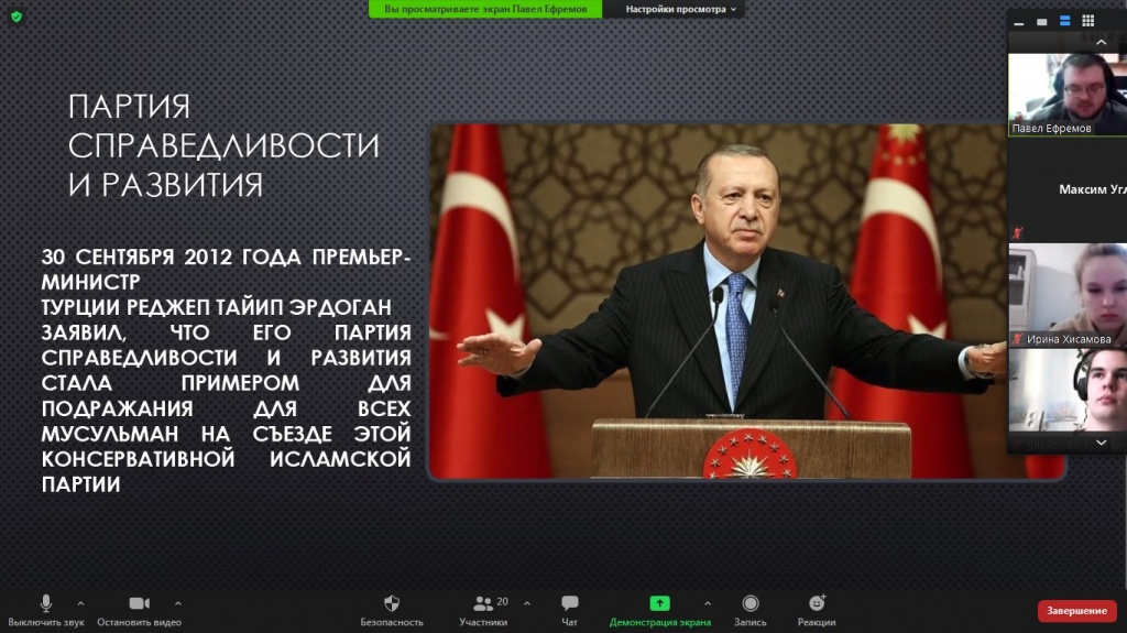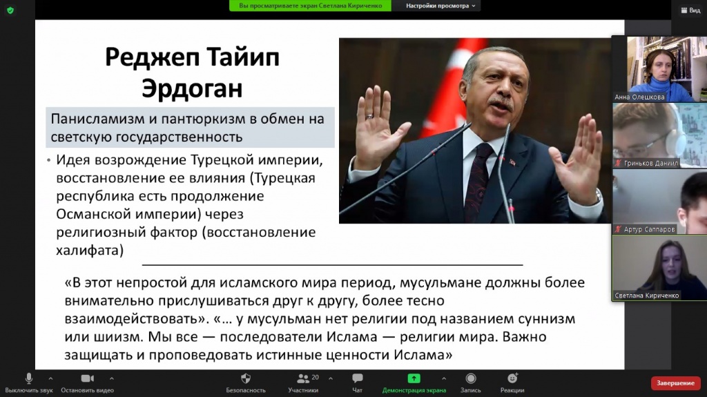 Выступление начала Анастасия Демина с анализа общего исторического развития Турции, проследив путь становления Османской империи. Затем Светлана Кириченко рассказала про различия панисламизма и пантюркизма в историческом контексте. Рассмотрение современных политических и политико-религиозных идей продолжил Павел Ефремов, который проанализировал заявления и действия президента Турции Р. Эрдогана, обозначил особенности его политического лидерства, представив аналитический портрет политика. Выступление завершила Анна Соболева, которая представила мнения экспертов относительно современного политического курса Турции.
