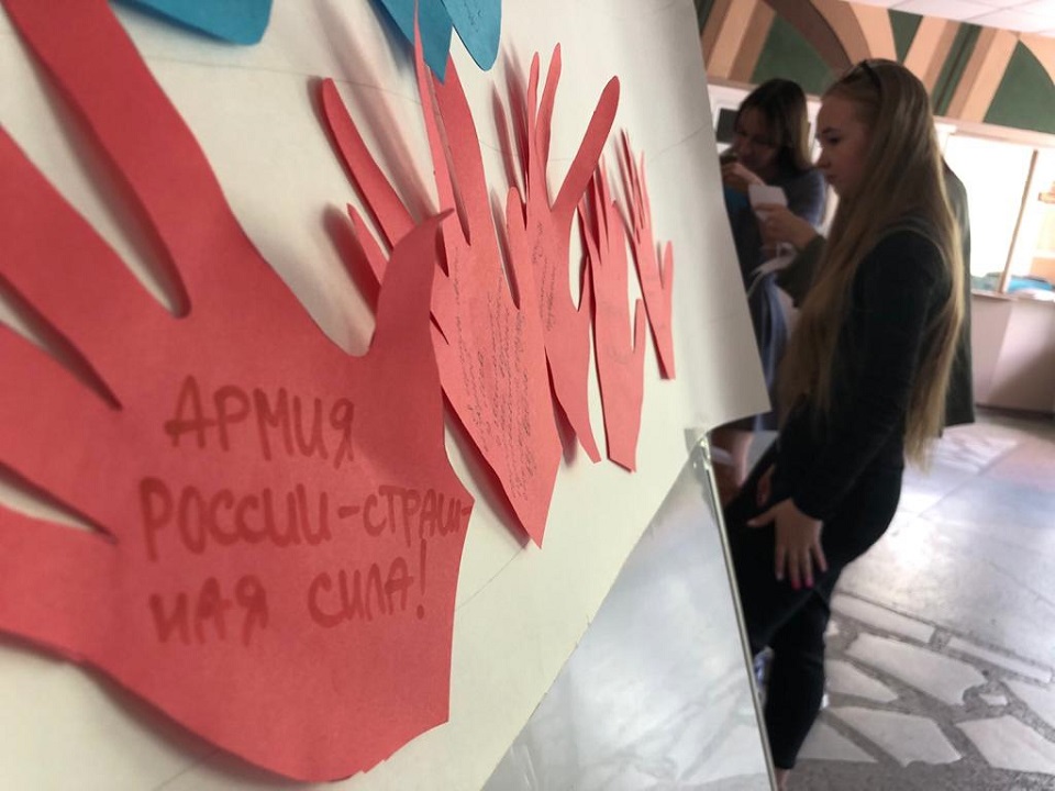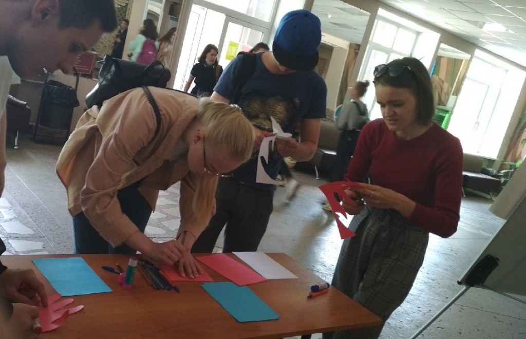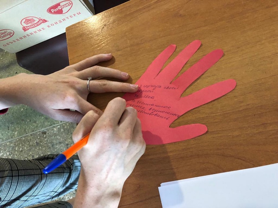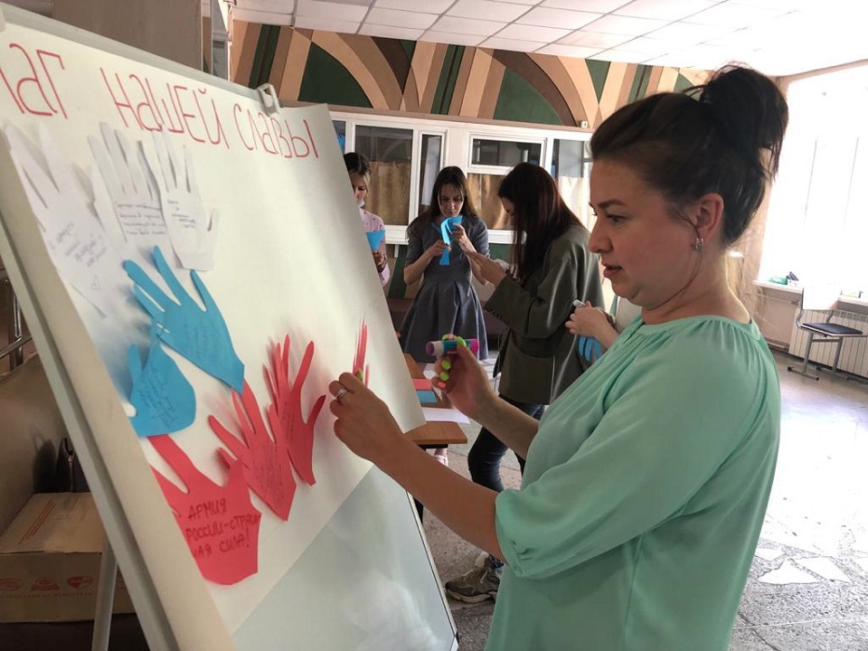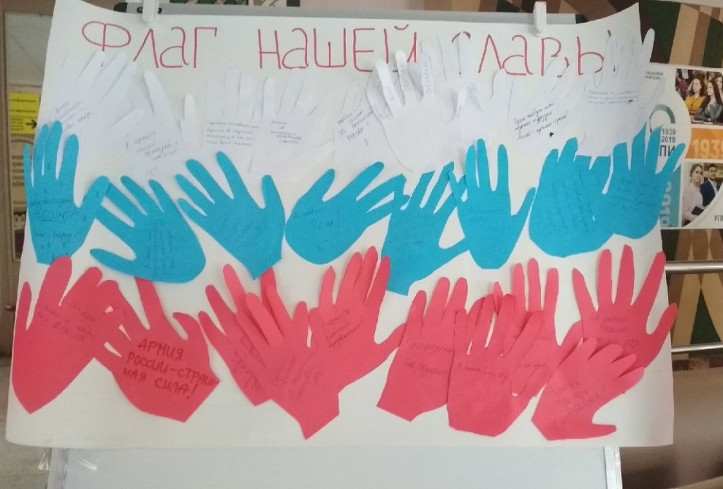 Суть акции заключалась в том, необходимо было указать за что ты любишь и гордишься своей Родиной. Участникам было предложено на листе цветной бумаги обвести, а далее вырезать свою ладонь. После каждый участник изложил свои мысли и прикрепил на ватман. В итоге, благодаря совместным усилиям получился большой и креативный флаг нашей страны.