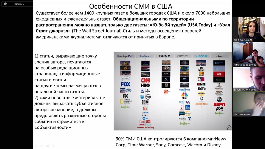Далее были определены особенности СМИ в США. Стоит отметить, что стиль и методы освещения новостей американскими журналами отличаются от принятых в Европе. Статьи, выражающие точку зрения автора, печатаются на особых редакционных страницах, а информационные статьи и статьи на другие темы размещаются в остальной части газеты. Также новостные материалы не должны выражать субъективное авторское мнение.