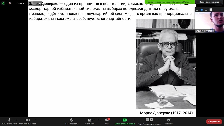 Дискуссия началась с ознакомления с избирательной системой Америки. Ее особенность заключается в том, что победитель определяется не напрямую избирателями, а коллегией выборщиков. Действует двухступенчатая система: избиратели выбирают между кандидатами в президенты от партий на избирательном участке, но последнее слово за выборщиками от штатов. Учитывая двухступенчатую систему, кандидат может получить меньший процент голосов на общенациональном уровне, но выиграть выборы за счет победы в конкретных штатах.