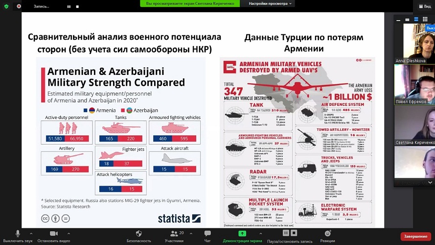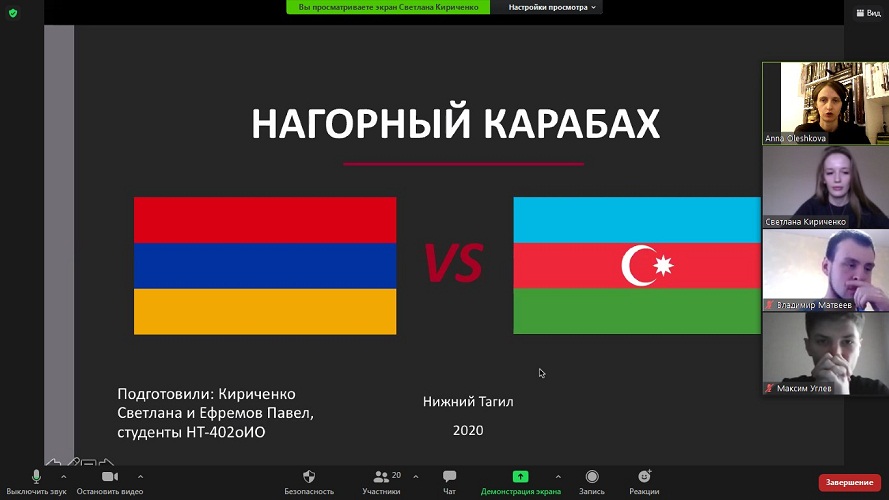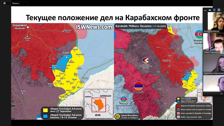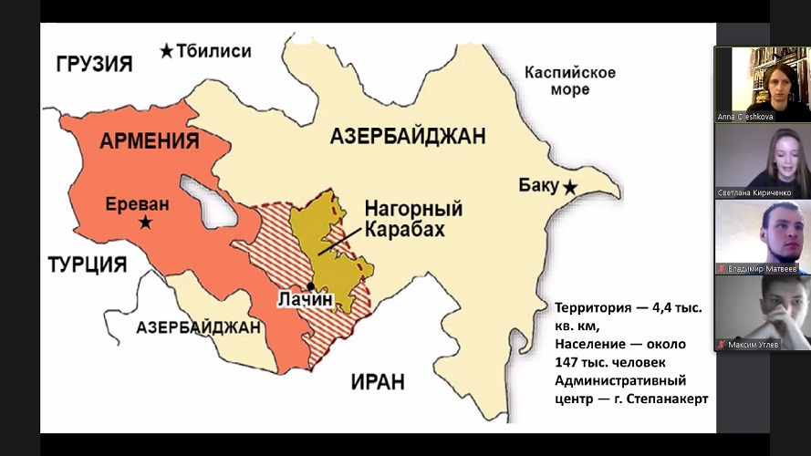 На повестке обсуждения – анализ современного конфликта в Нагорном Карабахе. Во время дискуссии докладчиками и другими участниками занятия были выявлены причины и предпосылки конфликта, касающиеся, главным образом, исторической принадлежности и спорного международного статуса Нагорного Карабаха; были обозначены точки зрения представителей Азербайджана и Армении на обострившийся конфликт.