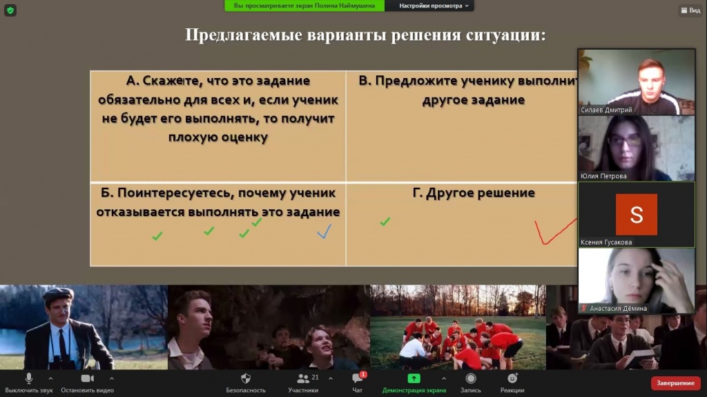 В ходе дискуссии были проанализированы основные композиционные моменты фильма в рамках рассмотрения педагогических ситуаций. Также были выявлены нравственные аспекты его сюжета, был детально охарактеризован образ учителя Джона Китинга, который вдохновил своих учеников на пересмотр своих жизненных устоев и интересов и пробудил у них любовь к поэзии и литературе.