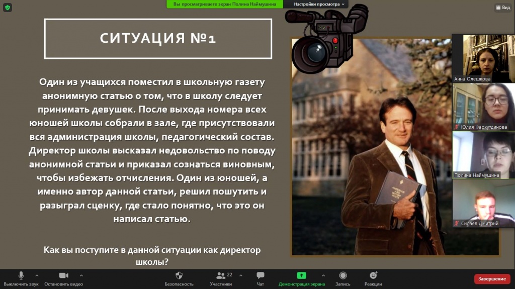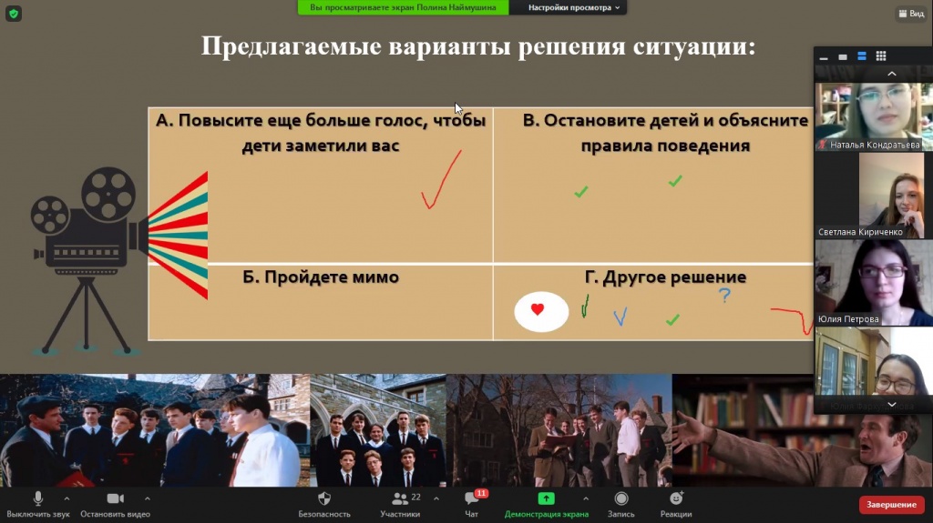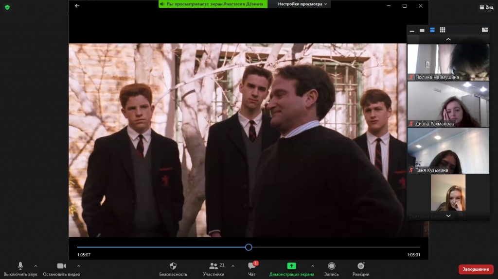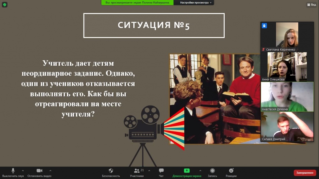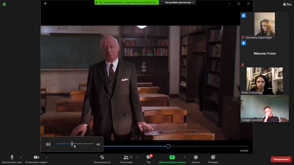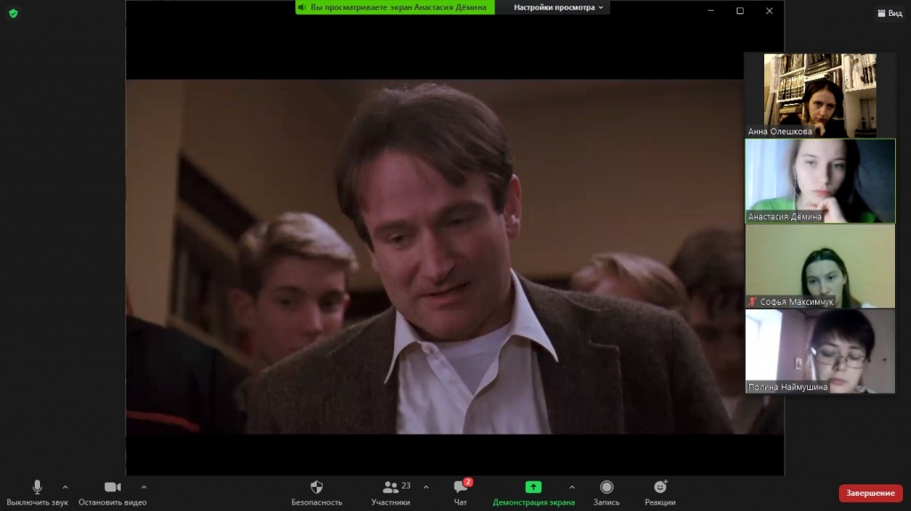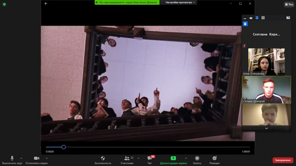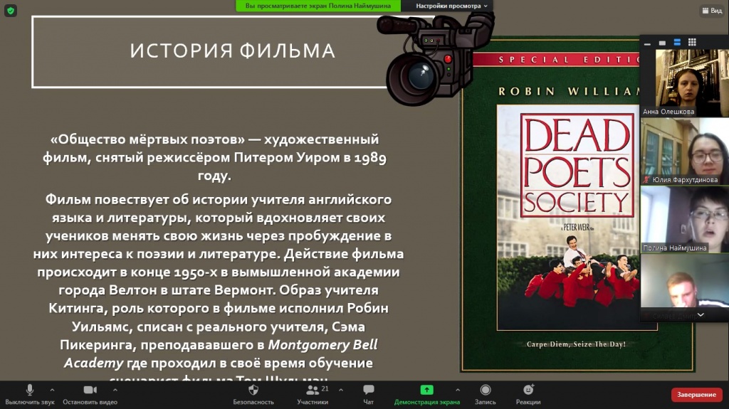 На социально-гуманитарном факультете продолжается цикл занятий «Педагогические кейсы в мировом кинематографе». 24 ноября студенты обсуждали фильм «Общество мертвых поэтов», снятого режиссером Питером Уиром в 1989 г.