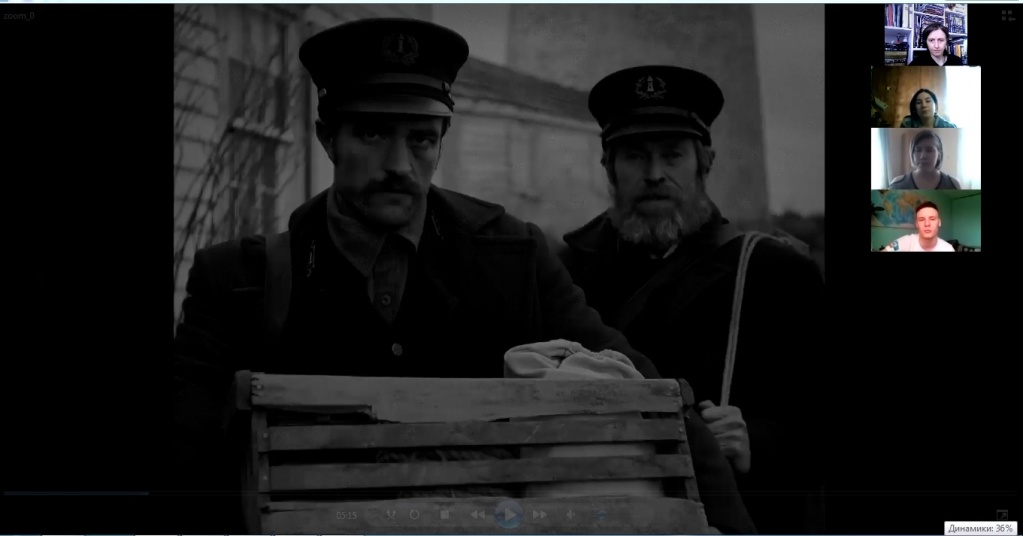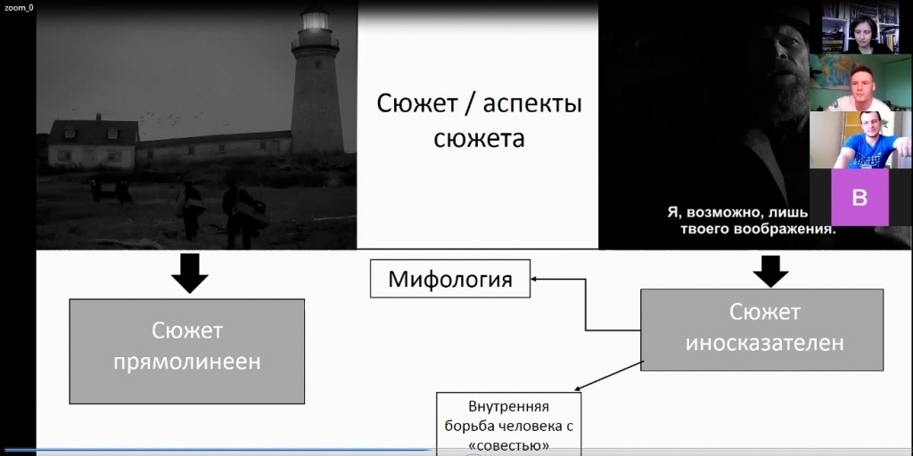 На повестке обсуждения – фильм Роберта Эггерса «Маяк». Влад Михайлюк, студент 4 курса СГФ, подготовил доклад, посвященный разным противоречивым интерпретациям сюжета фильма. Основной акцент был сделан на своеобразном разделении трактовок, которое можно обозначить в форме вопроса: «Происходящее в фильме – реальность или вымысел?»