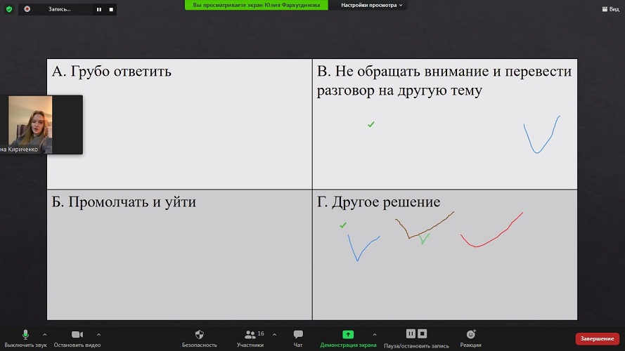 В онлайн-дискуссии на платформе Zoom студенты 4 курса СГФ предложили рассмотреть пять педагогических ситуаций, основанных на сюжете фильма «Республика ШКИД». Участникам конференции предлагалось поставить себя на место директора и выбрать готовый вариант решения данной ситуации или предложить свой, который бы положительно подействовал на ребят.