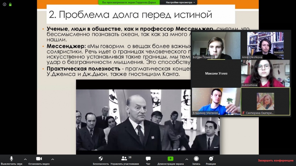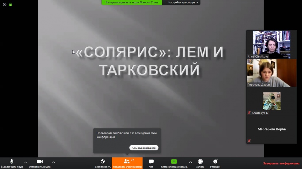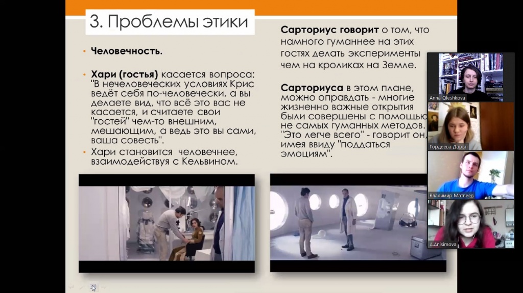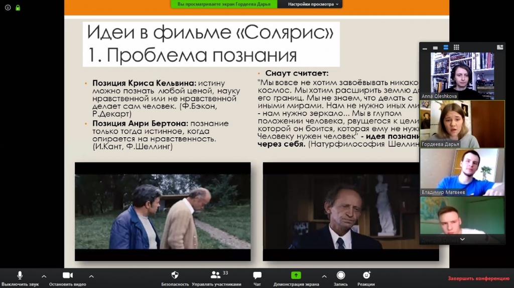В дистанционном онлайн-формате Zoom студенты обсудили фильм Андрея Тарковского «Солярис», снятый в 1972 г. по одноименному роману польского писателя Станислава Лема. Сегодня фильм А. Тарковского считается шедевром мирового кинематографа. Невероятно эстетичный благодаря его визуальному ряду, а также музыкальному сопровождению. Студенты ФХО и СГФ выступили в качестве докладчиков.