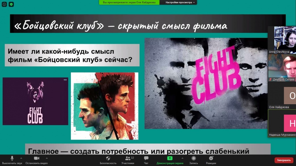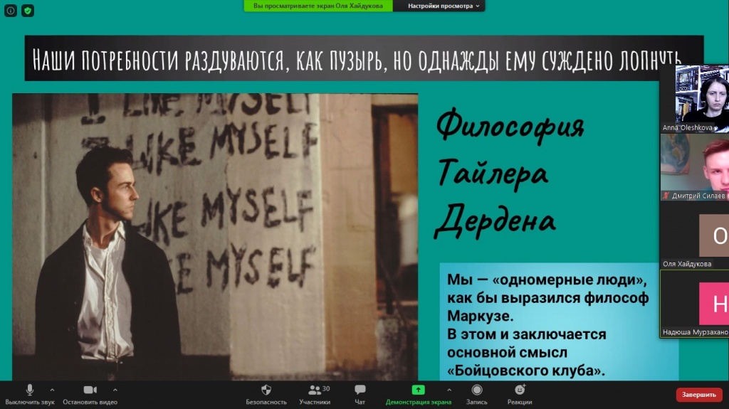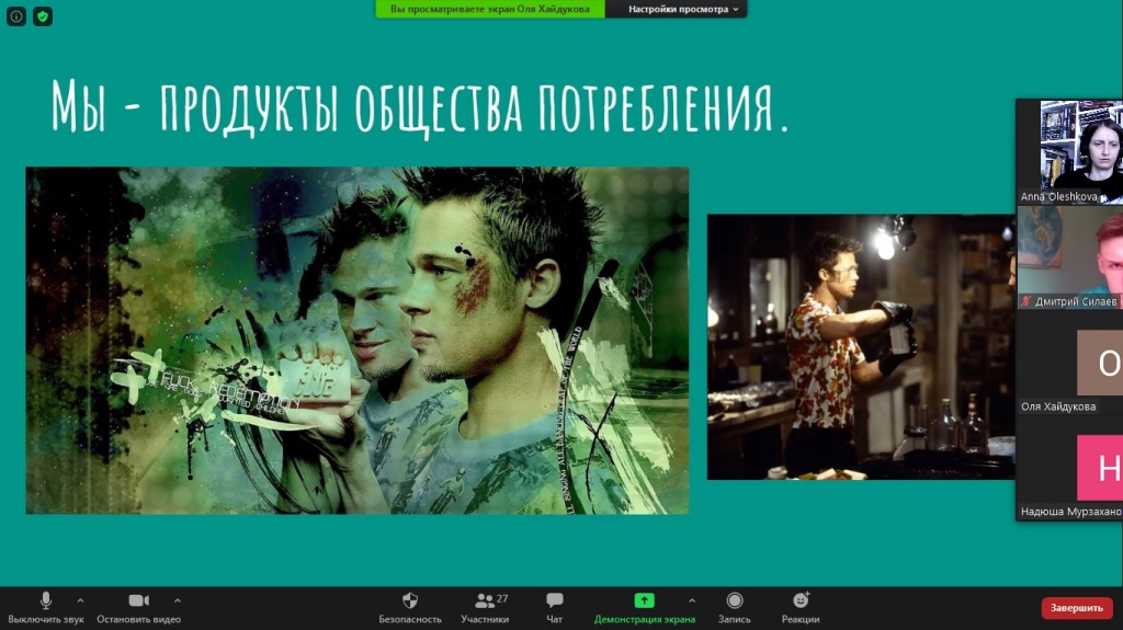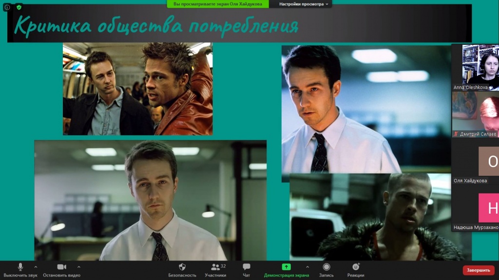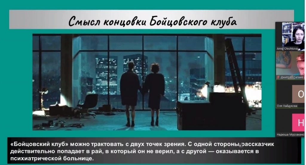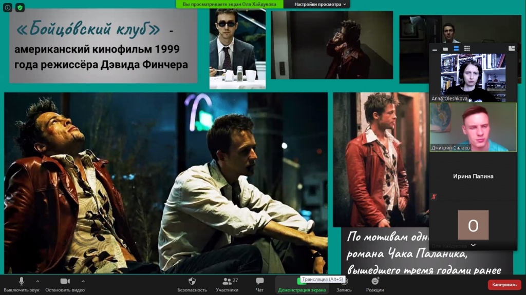 В дистанционном онлайн-формате Zoom обсуждался сюжет и проблемы фильма американского режиссера Дэвида Финчера «Бойцовский клуб», поставленный по одноименному роману писателя Чака Паланика.