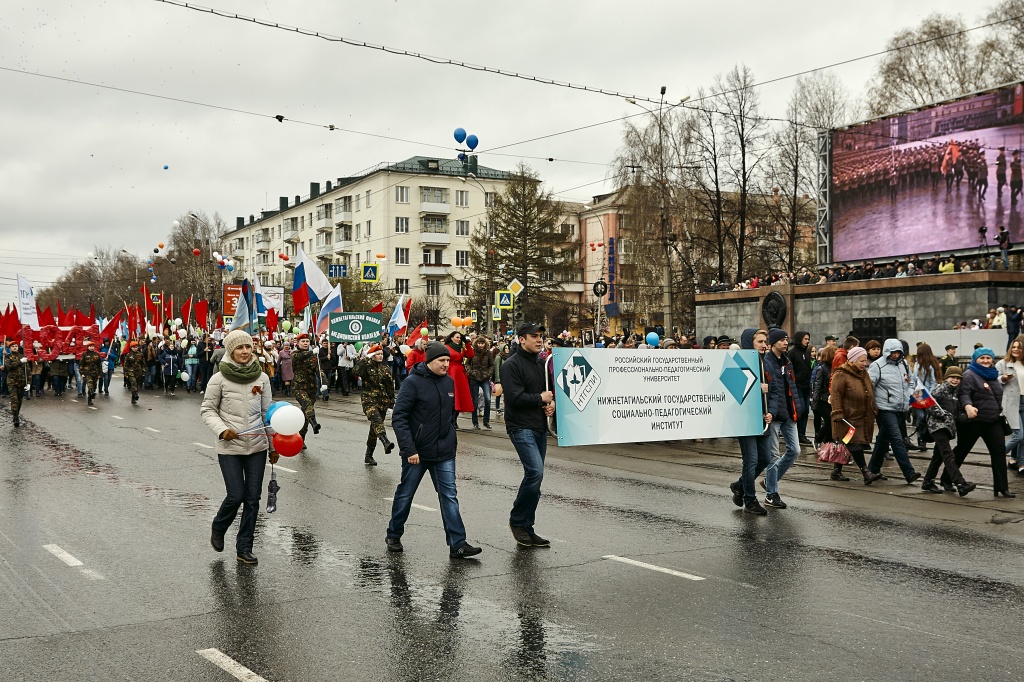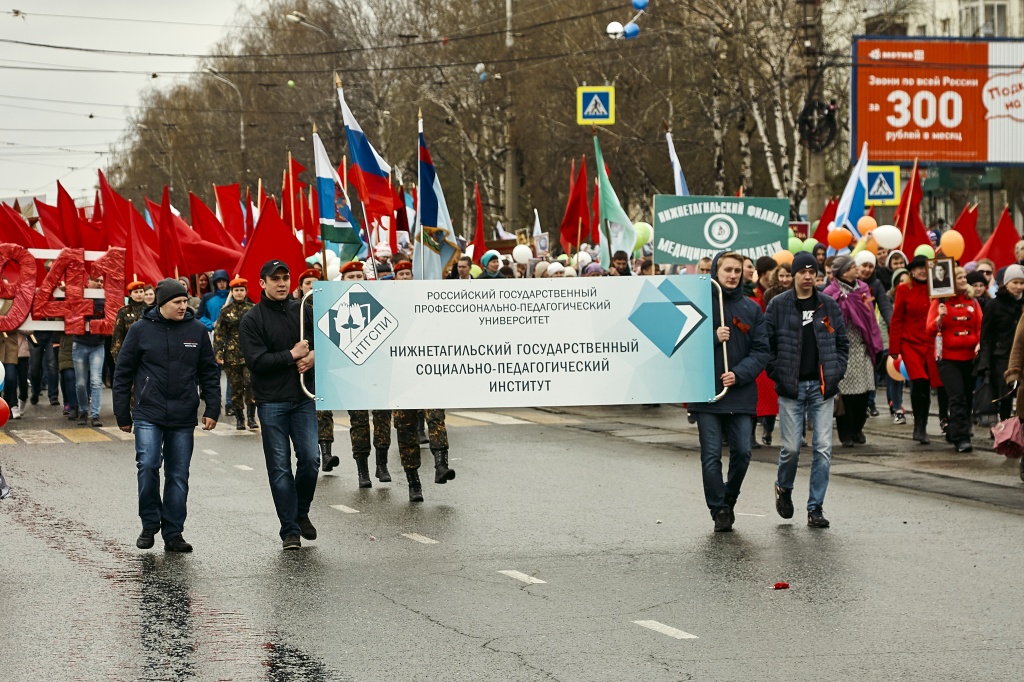 Возглавлял колонну нашего института Юнармейский отряд НТГСПИ под руководством заместителя декана по учебно-воспитательной работе факультета спорта и безопасности жизнедеятельности А. В. Неймышева, следом шел «Бессмертный полк», ряды демонстрантов украшали знамёна, ордена, флаги и стенд с памятными годами – 1941–1945, которые несли студенты, сотрудники и преподаватели института. Отдельное спасибо студентам, которые помогали в сборе реквизита для колонны.