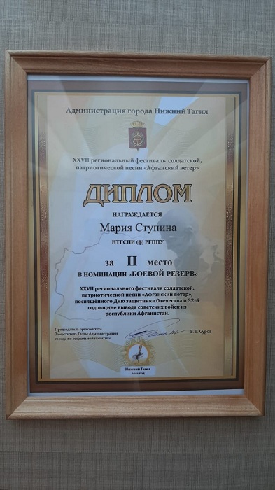 Призовые места получили те, кто не только красиво и трогательно исполнил выбранное произведение, но и вложил в свое выступление душу и сердце. Обладателем 2-го места в номинации «Боевой резерв» стала студентка 1 курса ФФМК Мария Ступина, участница вокальной студии «Sunrise» под руководством Марии Владимировны Котовой. Всем победителям были вручены традиционные дипломы и призы.