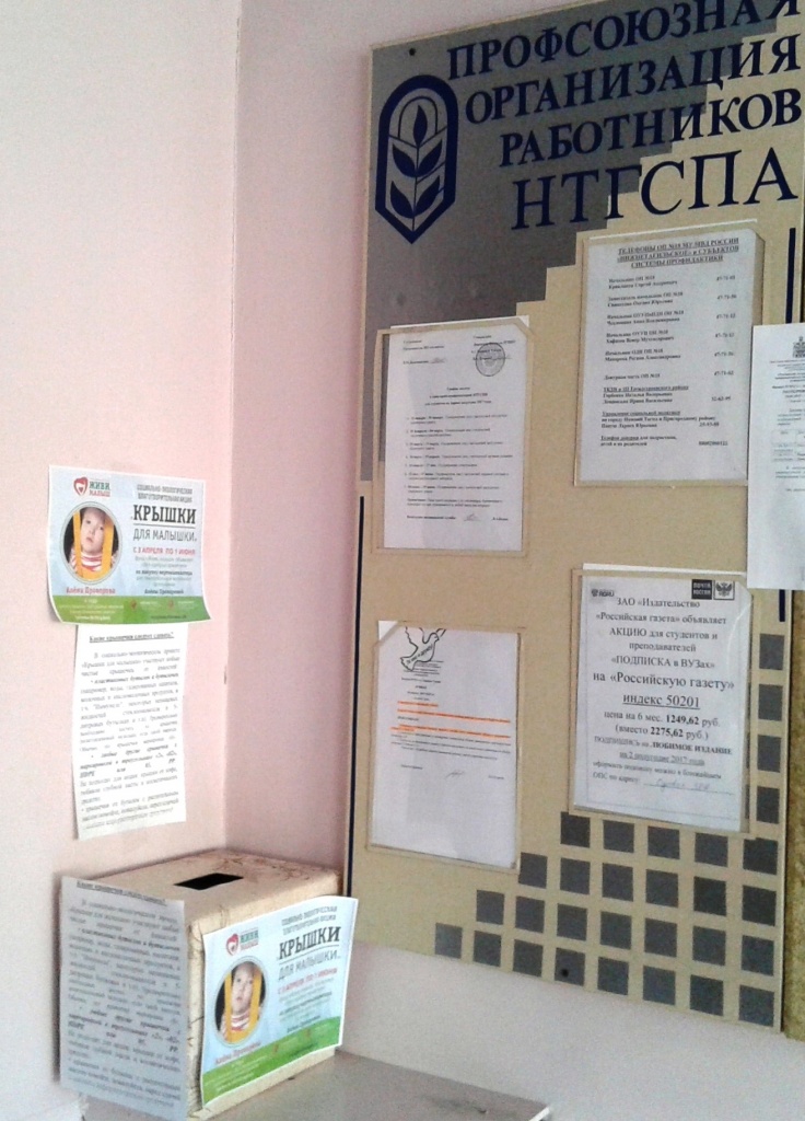 Профсоюзный комитет сотрудников и преподавателей НТГСПИ (ф) РГППУ совместно с научной библиотекой выступил инициатором сбора пластиковых крышек для помощи Алене. В вузе были организованы 3 точки сбора крышечек. Студенты и работники вуза охотно откликнулись на призыв фонда «Живи, малыш». Совместными усилиями было собрано около 6 кг пластиковых крышек. Все они будут сданы на переработку в Екатеринбург. На вырученные деньги и будет приобретен вертикализатор для Алены Проворовой.
