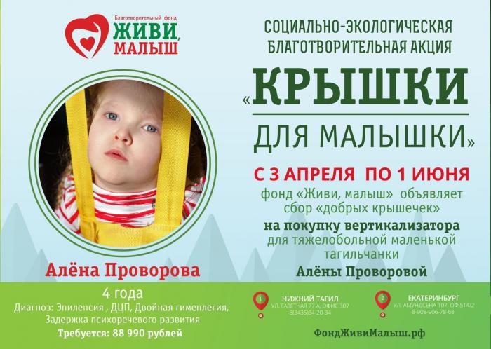С 3 апреля по 1 июня 2017 г. в Нижнем Тагиле благотворительным фондом «Живи, малыш» объявлена социально-экологическая акция «Крышки для малышки» по сбору пластиковых крышечек на покупку вертикализатора для тяжелобольной маленькой тагильчанки Алены Проворовой.