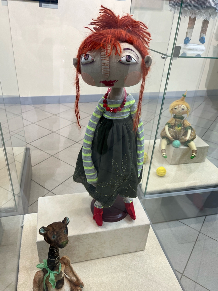 На второй выставке представлены работы Е. Ю. Воропаевой, которая работает в текстильной технике – шьет набивные куклы из ткани. У первых экземпляров одежда шилась отдельно, а сейчас чаще одежда несъемная. Как признается мастерица, ей никогда не хотелось пробовать другой материал для создания кукол, хотя для интереса и посещала разные мастер-классы, но все же именно ткань с ее разнообразием фактуры, цвета, рисунка вдохновляет.