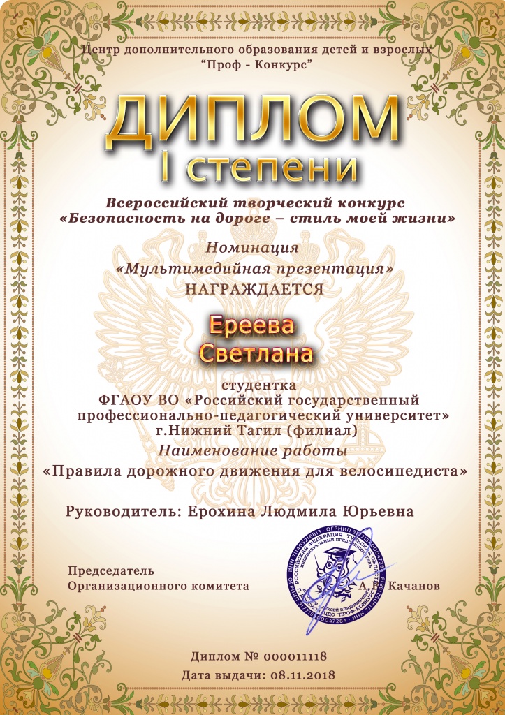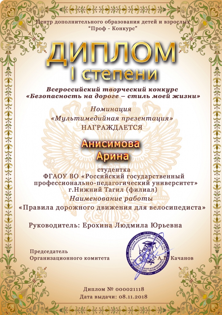 Всё о безопасности юных велосипедистов знают студенты факультета спорта и безопасности жизнедеятельности. Студентки первого курса Арина Анисимова и Светлана Ереева приняли участие во Всероссийском творческом конкурсе «Безопасность на дороге – стиль моей жизни». В своей возрастной категории по направлению «Правила дорожного движения для велосипедистов» в номинации «Мультимедийная презентация» они заняли первое место. Поздравляем победителей!