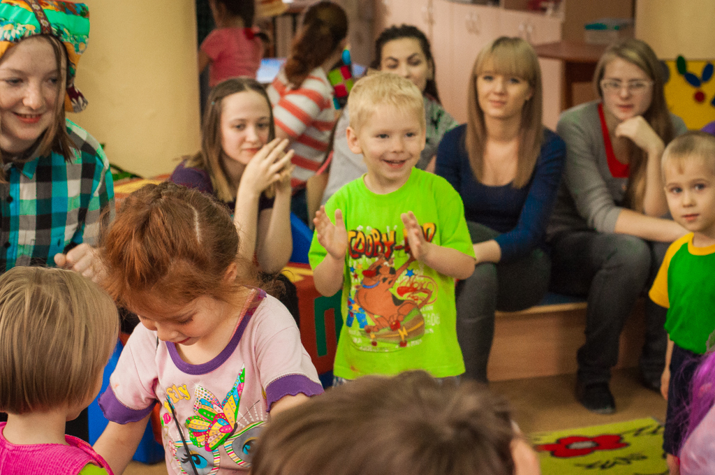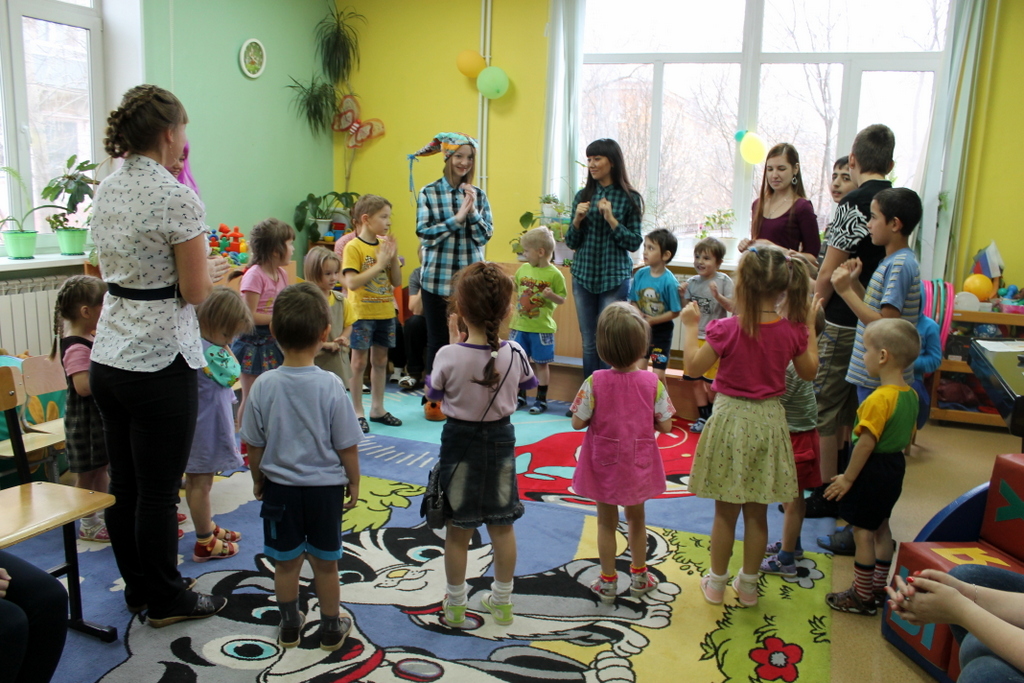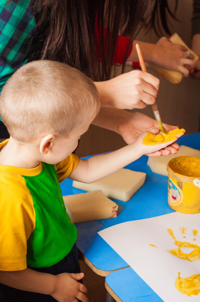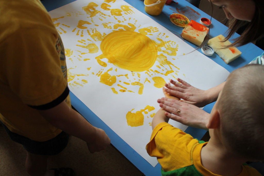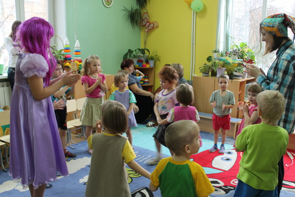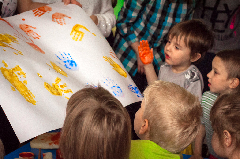 Мы пришли вместе с волшебными героями принцессой Нютой и Петрушкой. Водили хороводы, пели всем нам знакомые с детства песни и танцевали. В конце нашей встречи мы предложили детям позаниматься совместным творчеством. На листах ватмана малыши с удовольствием оставляли следы своих маленьких ладоней, разукрашенных в яркие цвета «волшебной» гуаши.