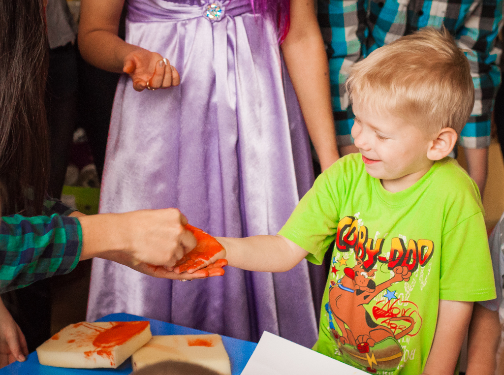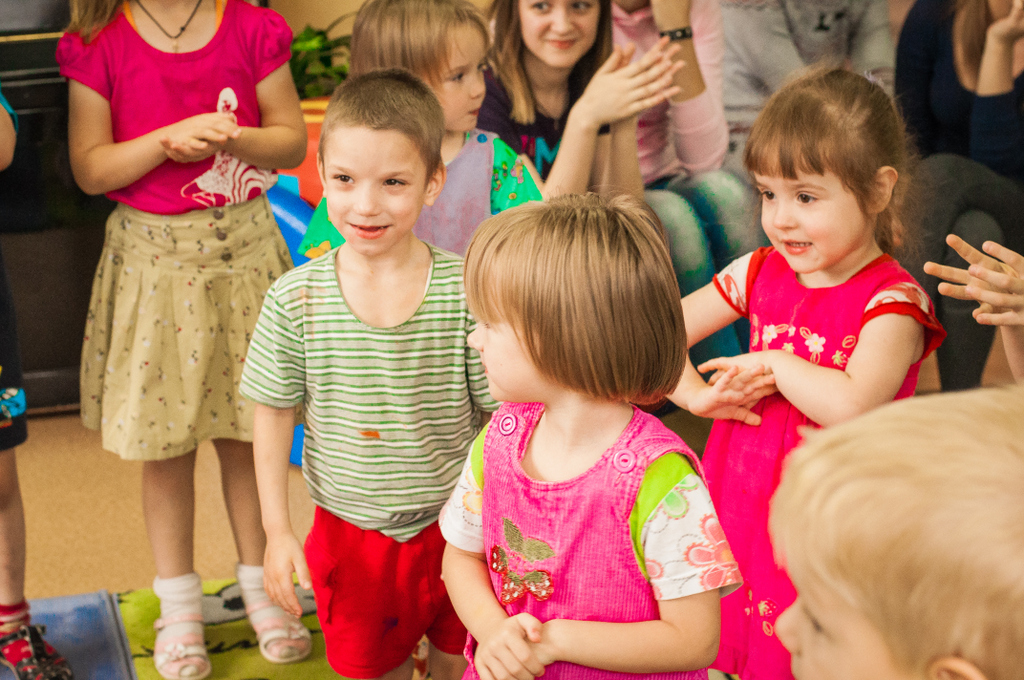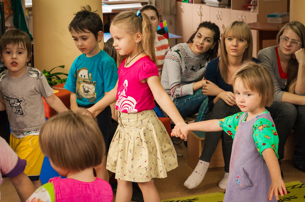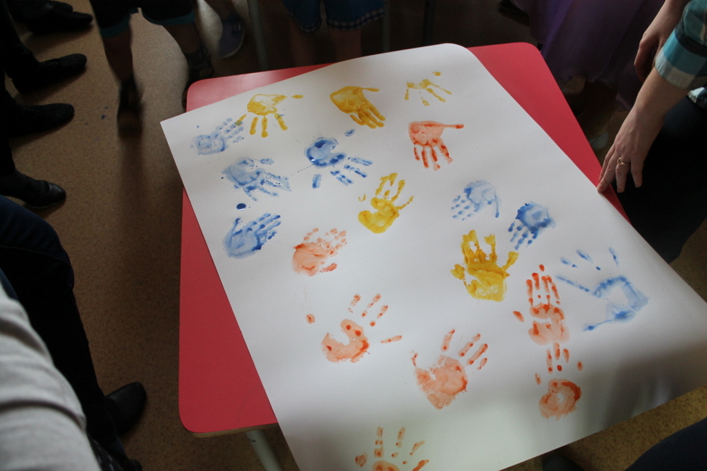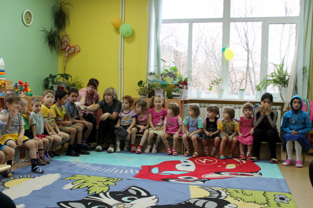 Мы пришли вместе с волшебными героями принцессой Нютой и Петрушкой. Водили хороводы, пели всем нам знакомые с детства песни и танцевали. В конце нашей встречи мы предложили детям позаниматься совместным творчеством. На листах ватмана малыши с удовольствием оставляли следы своих маленьких ладоней, разукрашенных в яркие цвета «волшебной» гуаши.