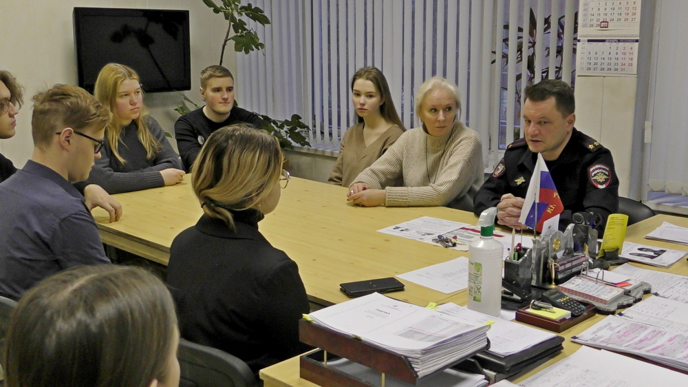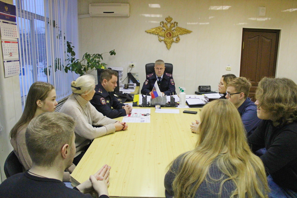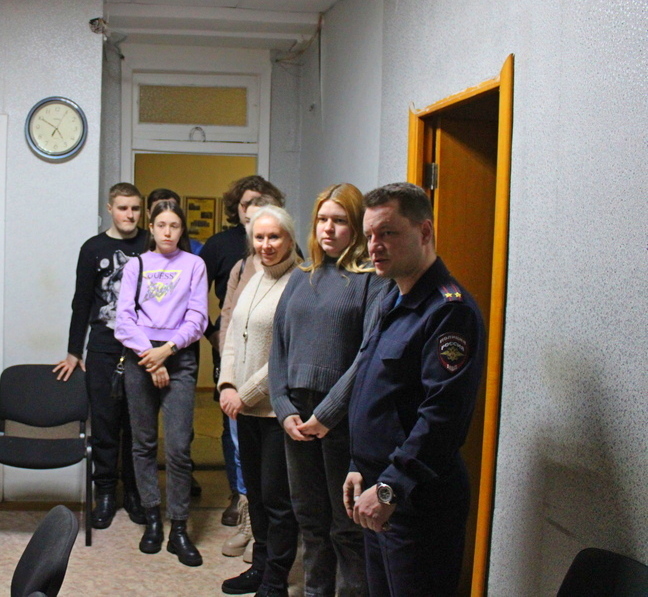 В мероприятии приняли участие начальник отдела полиции подполковник Андрей Кузнецов и его заместитель подполковник Антон Силантьев. Знакомство с работой отдела началось с кабинета начальника отдела, где ежедневно собираются руководители всех подразделений на оперативные совещания с руководством Главного и Межмуниципального управления. Подполковник Силантьев рассказал об особенностях и специфике службы в различных подразделениях полиции, довел информацию о том, какие задачи выполняют полицейские в своей повседневной деятельности. Заместитель начальника отдела полиции уделил особое внимание вопросу профилактики преступлений в сфере банковских мошенничеств и предложил студентам посодействовать сотрудникам правоохранительных органов, провести профилактические беседы со своими знакомыми, пожилыми родственниками и рассказать, что ни в коем случае нельзя переводить денежные средства с банковских карт неизвестным лицам, даже если они представляются сотрудниками правоохранительных органов либо представителями финансовых организаций.