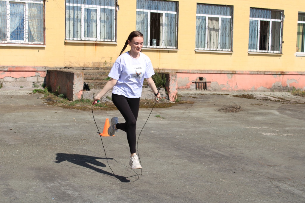 6-й этап – «Давно ли не прыгали?». Эстафета со скакалкой. Участники поочередно прыгали на скакалке до фишки, не переставая прыгать, оббегали ее, и, так же прыгая, возвращались к своим и передавали эстафету.
