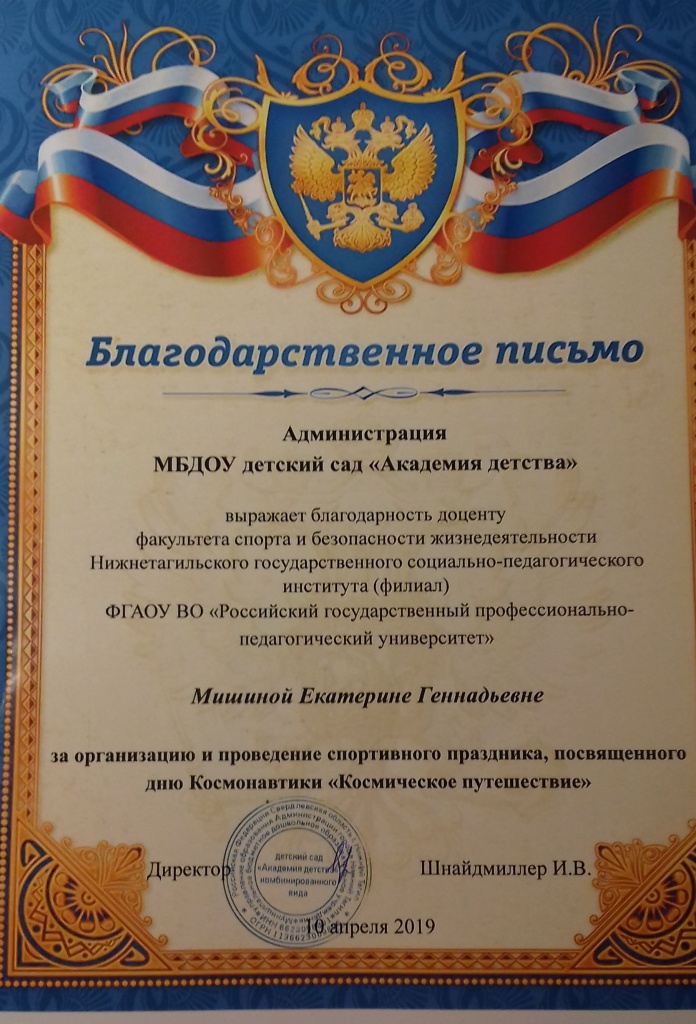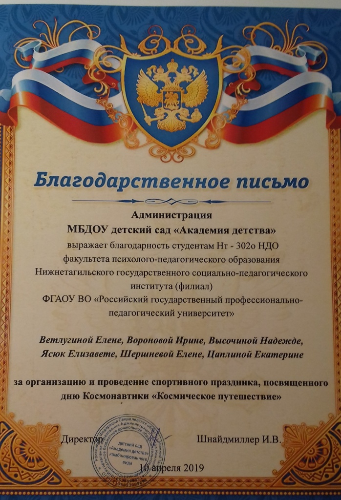 В рамках изучения дисциплины «Технологии физического воспитания детей дошкольного возраста» 10 апреля 2019 г. студенты 3 курса ФППО под руководством доцента кафедры ФСБЖ Екатерины Геннадьевны Мишиной организовали и провели спортивный праздник «Космическое путешествие» для детей младшей и старшей групп МБДОУ детский сад «Академия детства». Данное мероприятие было приурочено к Всемирному дню авиации и космонавтики. Дети активно принимали участие в конкурсах и заданиях, были полны позитивных эмоций, успешно прошли «Школу юного космонавта».