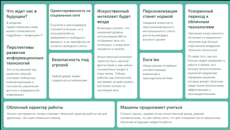 Оценивая работы, можно сделать вывод, что большая часть участников связывает будущее информационно-коммуникационных технологий с новыми разработками в области умного дома, искусственного интеллекта и машинного обучения.