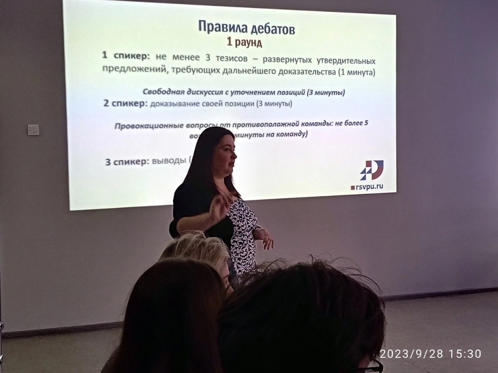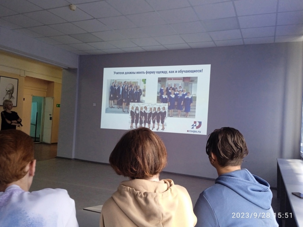 В игровой форме первокурсники обсудили внешний вид педагога, на практике показывая свое ораторское мастерство и дар убеждения. В ходе оживленной дискуссии удалось прийти к выводу, что имеет место быть единая корпоративная форма для педагогов, но она должна быть красивой, удобной, не стеснять людей с разными фигурами. Скорее, педагоги должны хотеть ее надеть, но не обязаны в ней ходить. Возможен классический деловой стиль одежды, но желательно его разнообразить отдельными деталями в соответствие с модными тенденциями, которые позволят показывать пример детям как одеваться современно, стильно, но не вульгарно. Многие предложили дополнять классический стиль какими-то аксессуарами (пояс, воротник, брошь и др.), подчеркивающими индивидуальность педагога.