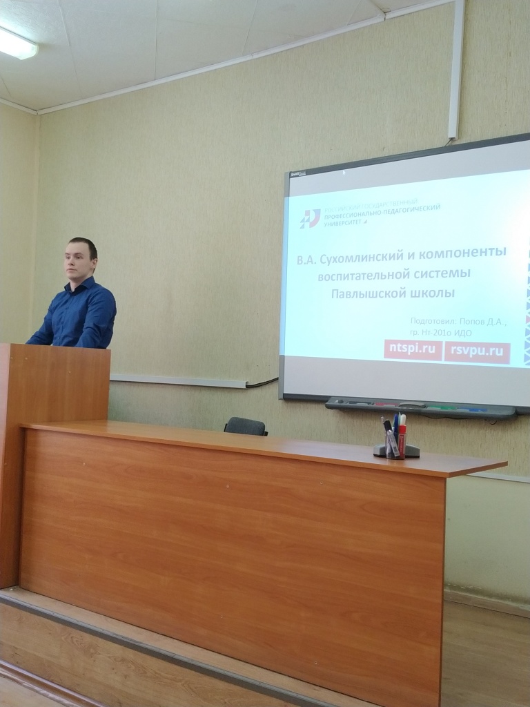 С первым публичным докладом выступил Данил Попов, студент группы Нт-201о ИДО СГФ. Предметом просветительского выступления стали компоненты воспитательной системы В. А. Сухомлинского. Данная тема заинтересовала Данила еще в рамках заседаний научного кружка, а потом органично вплелась в содержание семинарского сообщения на занятиях «Теории воспитания и обучения».