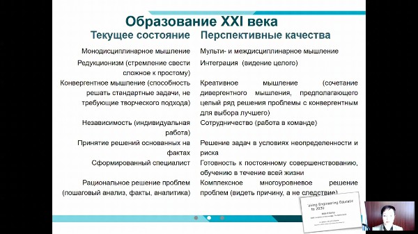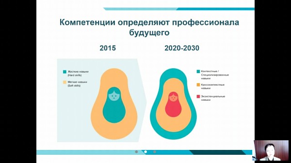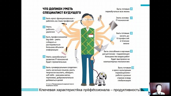 Сначала спикер упомянула о двух выдающихся футурологах ‒ Ю. Н. Харари и Р. Курцвейле – и их трудах, в которых ученые отразили прогнозы по развитию общества. Виктория Вячеславовна рассказала о навыках и качествах, которые получали выпускники прошлых десятилетий. Но время не стоит на месте, и требования меняются. Именно поэтому В. В. Дикова акцентировала внимание участников встречи на перспективных качествах будущего специалиста, а также компетенциях учителя, необходимых для формирования этих качеств.