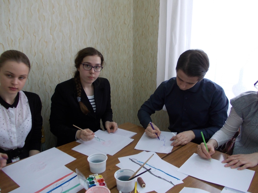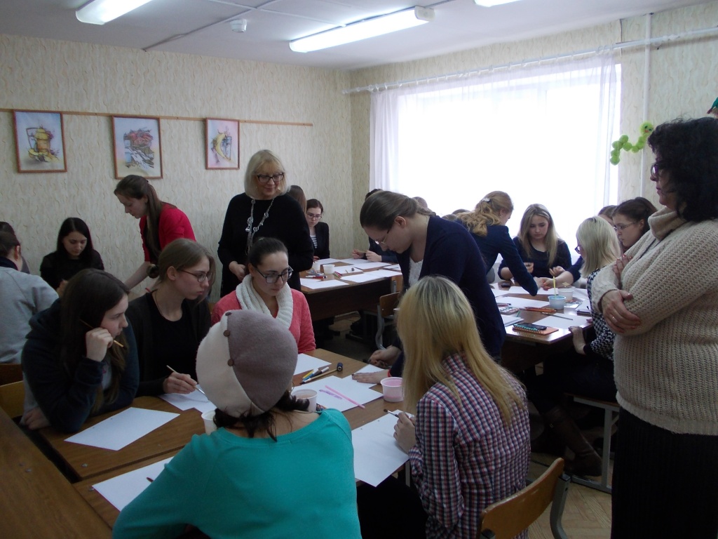 Продолжилась встреча в кабинете изобразительного искусства, где гостям было предложено выполнить творческие работы в трех оригинальных и очень простых техниках. Свои работы участники мастер-класса могли забрать с собой.