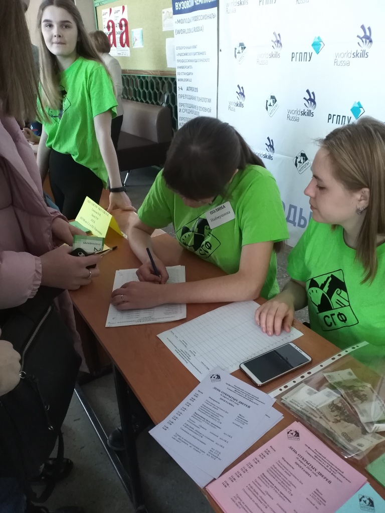 Большую помощь в организации и проведении Дня открытых дверей оказали студенты СГФ. Ими были сняты три рекламных ролика и разработаны информационные буклеты. Ролики демонстрировались перед началом собрания в актовом зале, а буклеты старшеклассники и их преподаватели получили в свои руки в момент регистрации. Студенты-волонтеры встречали и сопровождали гостей, делились с ними своими впечатлениями о студенческой жизни.