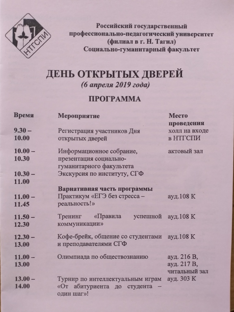 В субботу, 6 апреля 2019 г., в НТГСПИ прошел День открытых дверей социально-гуманитарного факультета, который традиционно организуется в дни школьных каникул. В этот день в актовом зале НТГСПИ собралось 219 школьников, многие из которых приехали со своими родителями и учителями.
