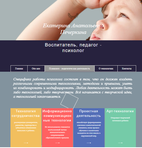 Два задания практики соответствовали тем, которые предлагаются студентам при прохождении аттестации в формате демонстрационного экзамена Worldskills. Это научно-методическое обоснование решения ситуативной педагогической задачи и разработка сайта педагога-психолога, поиск информации по заданной теме, аналитическая обработка и представление ее в различных форматах на электронном ресурсе. Студенты успешно их выполнили, отметив, что данные задания только углубили их профессиональное мастерство. На основании этих заданий был собран банк ситуативных педагогических задач, который будет использоваться на практических занятиях у студентов 1–2 курсов.