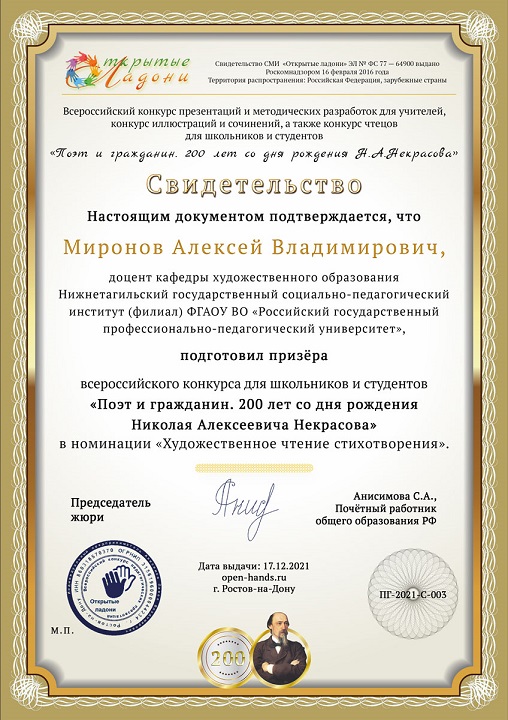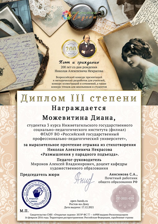 Поздравляем Диану Можевитину, студентку 3 курса факультета художественного образования (профиль «Музыкальное и театральное искусство»), с дипломом лауреата III степени Всероссийского конкурса чтецов «Поэт и гражданин. 200 лет со дня рождения Н. А. Некрасова» (Всероссийский конкурс педагогических презентаций «Открытые ладони», Ростов-на-Дону)!