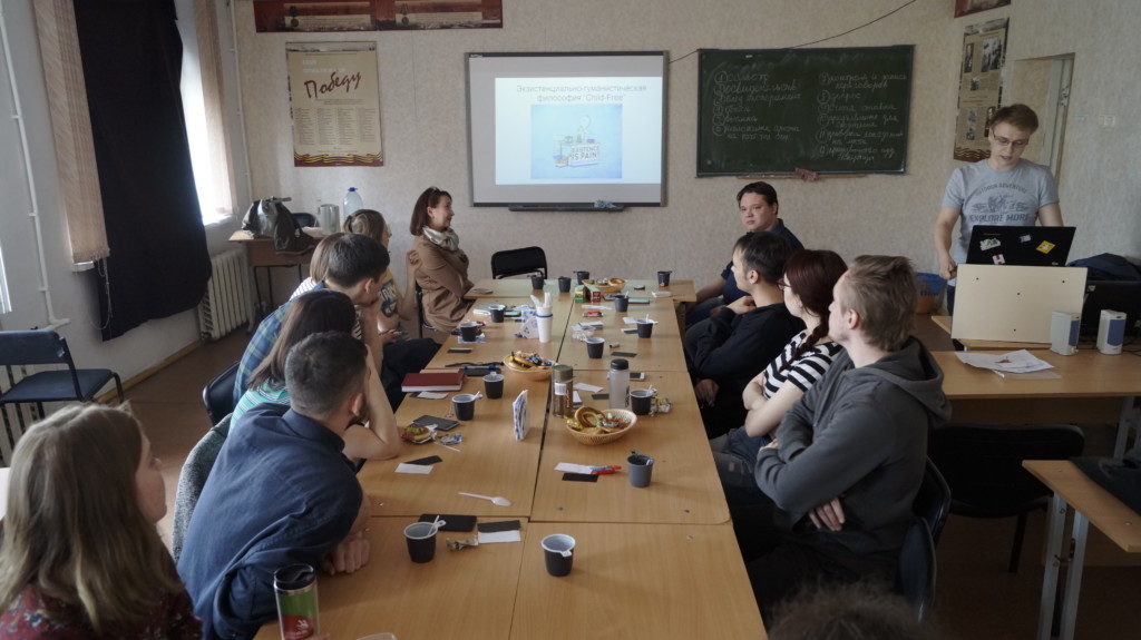 Основной темой майского заседания стала философия Childfree («чайлдфри»), которая характеризуется сознательным нежеланием рожать детей во имя личной свободы. В дискуссии принимали участия студенты 2, 3 и 4 курсов СГФ, ФФМК, преподаватели социально-гуманитарного факультета и инициаторы создания клуба – представители Нижнетагильской епархии, Скорбященского монастыря – иерей Павел Козлов – клирик храма прп. Сергия Радонежского, психолог Центра защиты материнства и детства «Дар жизни» Людмила Павловна Свиридова, представители Скорбященского женского монастыря Светлана Георгиевна Юсупова и Вера Александровна Чемезова. Тема стала логическим продолжением предыдущего собрания клуба – «Молодёжные браки и добрачные отношения», поэтому студенты были подготовлены и активно вступали в диалог. Основной целью встречи стало понимание феномена Childfree в контексте российской культуры, для этого было очень важно мнение именно молодёжи.