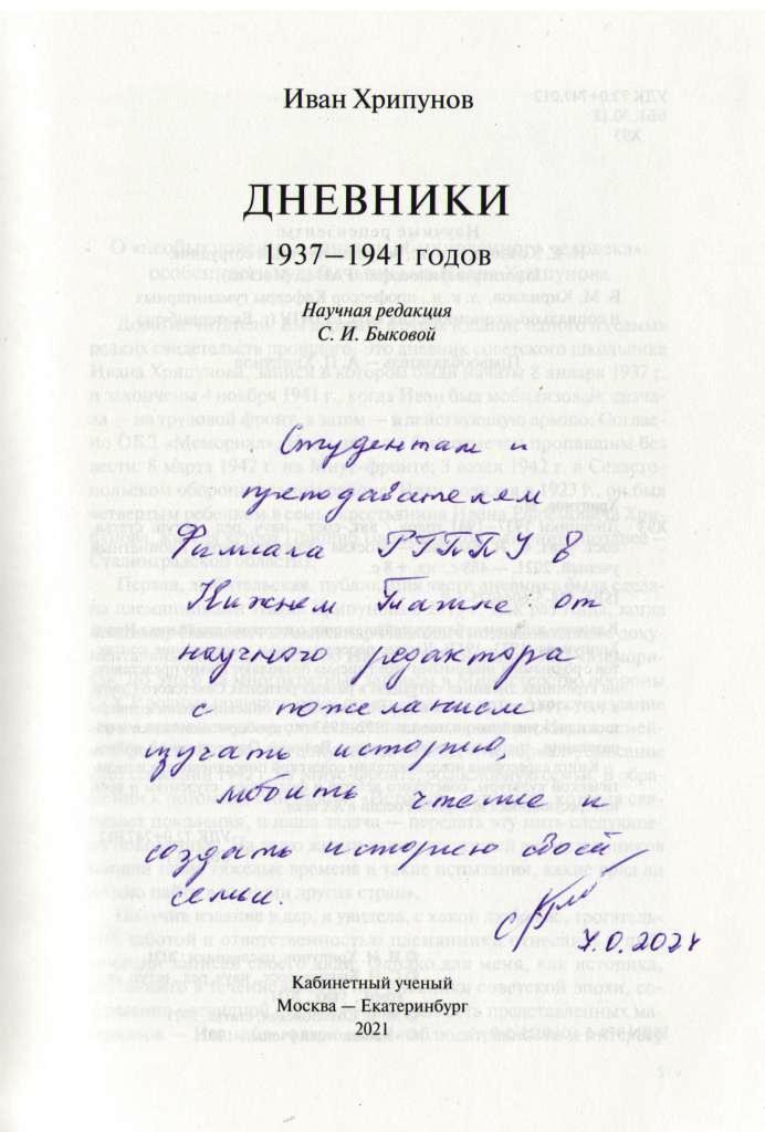 Фонд отдела информационных ресурсов НТГСПИ пополнился новым изданием – Дневниками Ивана Хрипунова. Книгу в дар нашей библиотеке передала Светлана Ивановна Быкова, канд. ист. наук, доцент кафедры зарубежного регионоведения Уральского федерального университета, научный редактор и автор вступительной статьи данного издания. В нем публикуются дневники советского школьника Ивана Хрипунова, который решил записывать на страницах блокнотов «заметки дня», фиксировать в рассказах, стихах и рисунках происходящие события, личные чувства, мысли и увлечения. Частые переезды семьи и сохранение контактов с родными и знакомыми через письма позволили Ивану представить на страницах дневника ситуацию в разных регионах Советского Союза в 1937–1941 гг. Дневник содержит подробные описания коллективизации и раскулачивания, голода 1932–1933 гг., проблем экономики и образования, трагедии первых месяцев Великой Отечественной войны.