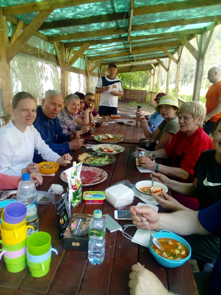 После погрузки на катамараны у деревни Харенки началась водная часть маршрута с посещением самого величественного «бойца» – камня Омутного. На стоянке туристов ждал вкусный горячий обед. Закончился сплав в деревне Еква.