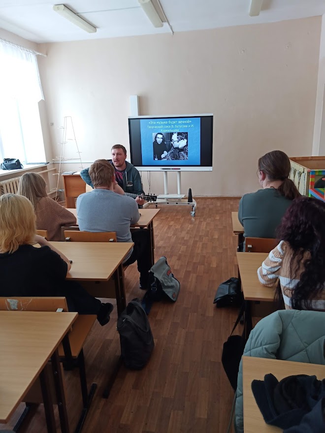 Во время занятия лектор обратил внимание на то, что в русском роке 80-х гг. группа «Nautilus-Pompilius» периода сотрудничества с И. Кормильцевым была уникальным явлением: она представляла собой тандем автора текстов и исполнителя песен. Уникальность этого тандема была в том, что он соединил совершенно разных людей. Кормильцев – яркий общественный деятель, радикальный левый интеллектуал. Бутусов же, напротив, человек, отрешенный от какой бы то ни было общественной деятельности, погруженный в свой личный мир. Тем не менее, их сотрудничество оказалось плодотворным.