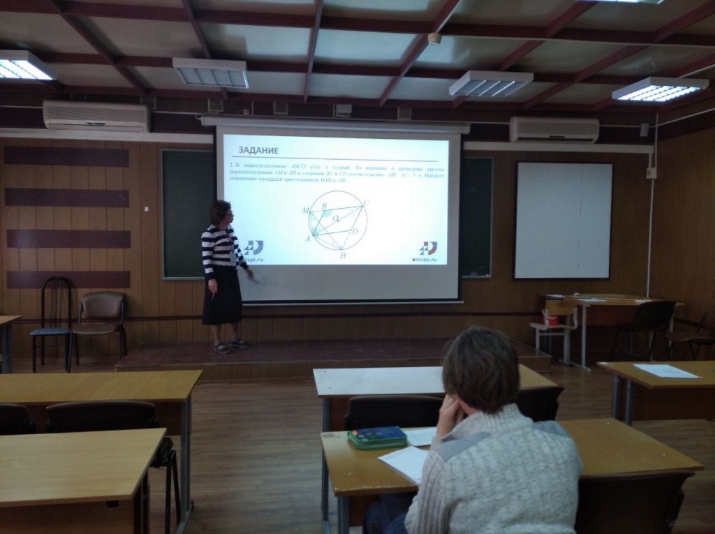 Под руководством к. п. н, доцента кафедры ИТФМ Т. Ю. Паршиной и к. п. н, доцента кафедры ИТФМ Е. В. Вязововой был проведен обучающий мастер-класс по решению планиметрических задач с дополнительным построением окружности. Как и в прошлом году, мастер-класс проводился в одной аудитории двумя преподавателями. Участники чемпионата под руководством ведущих находили решение одной и той же задачи, используя теорию треугольников, и с помощью дополнительного построения окружности.