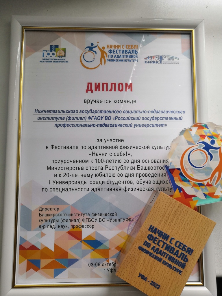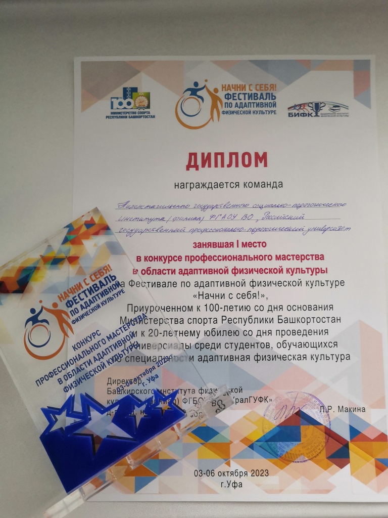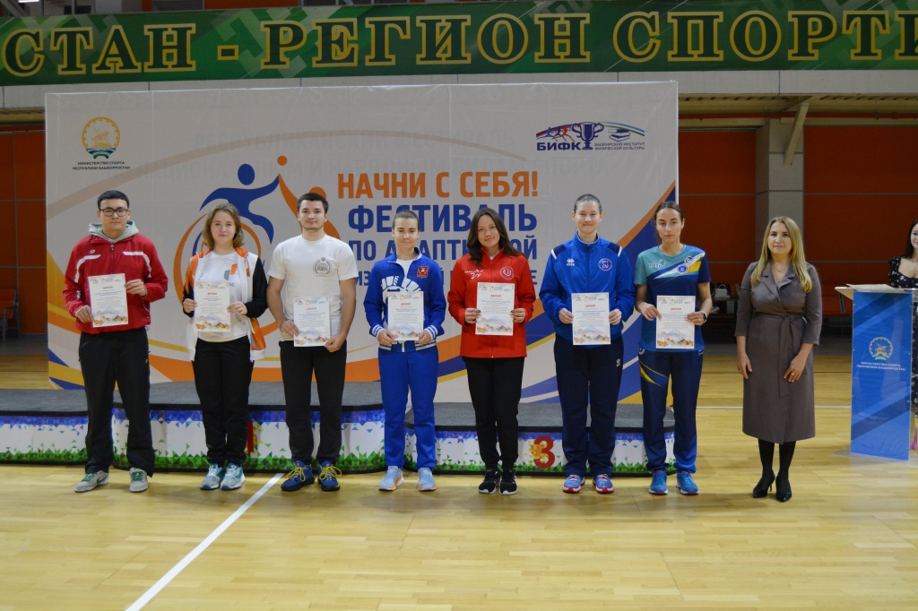 С 3 по 6 октября на базе Центра спортивной подготовки имени Римы Баталовой (г. Уфа) прошел Фестиваль по адаптивной физической культуре «Начни с себя!», приуроченный к 100-летию со дня основания Министерства спорта Республики Башкортостан и к 20-летнему юбилею со дня проведения I универсиады среди студентов, обучающихся по специальности «Адаптивная физическая культура». В нем принимали участие студенты, которые обучаются по направлению «Адаптивная физическая культура» и в будущем планируют помогать в реабилитации людям с ограниченными возможностями здоровья.