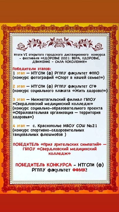 С 6 по 12 декабря прошел традиционный «Фестиваль здоровья». Каждый день был насыщен различными мероприятиями. В течение всей недели проходил VI открытый городской дистанционный конкурс-фестиваль «Здоровье – 2021: вера, здоровье, движение – сила поколения!», в котором приняли участие команды из 6 человек, представляющие образовательные организации Нижнего Тагила и его пригорода: