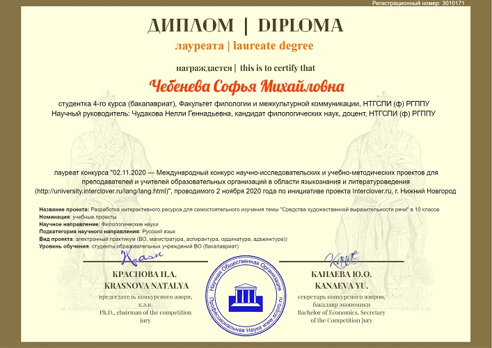 Приятно осознавать, что все твои старания не напрасны. Стоит отметить, что в разработке проекта нам очень помогли знания информационных технологий, которые были получены на соответствующих дисциплинах. И если бы не нестандартное задание по методике преподавания русского языка, мы бы не поучаствовали в данном конкурсе. В этом, безусловно, заслуга нашего научного руководителя Нелли Геннадьевны Чудаковой.