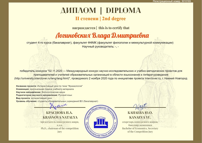 Надо признаться, что мы не планировали участвовать в международном конкурсе. Но на одном из занятий по методике преподавания русского языка нам дали задание разработать проект интерактивного урока. После представления наших разработок было принято решение лучшие из них отправить на международный конкурс научно-исследовательских и учебно-методических проектов, проводимый по инициативе проекта Interclover.ru, г. Нижний Новгород.