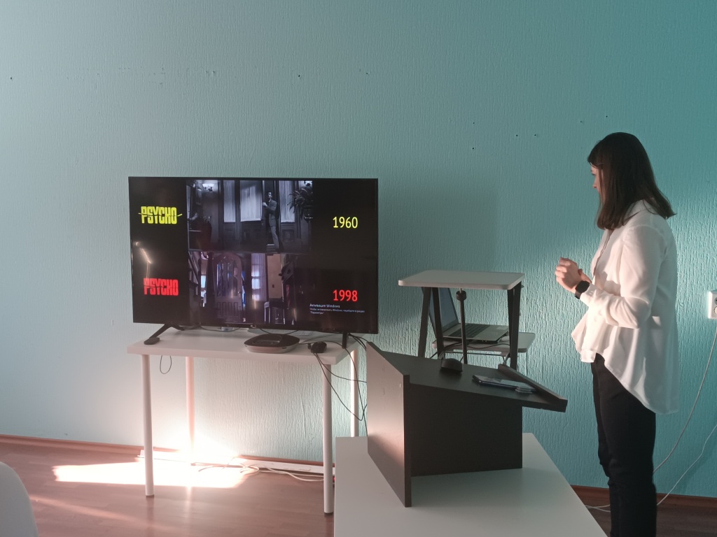 Нам удалось проанализировать визуальный ряд, выделить такие приемы, как «взгляд Бога» и разрушение «четвертой стены». Отдельное внимание уделили роли звукового сопровождения.