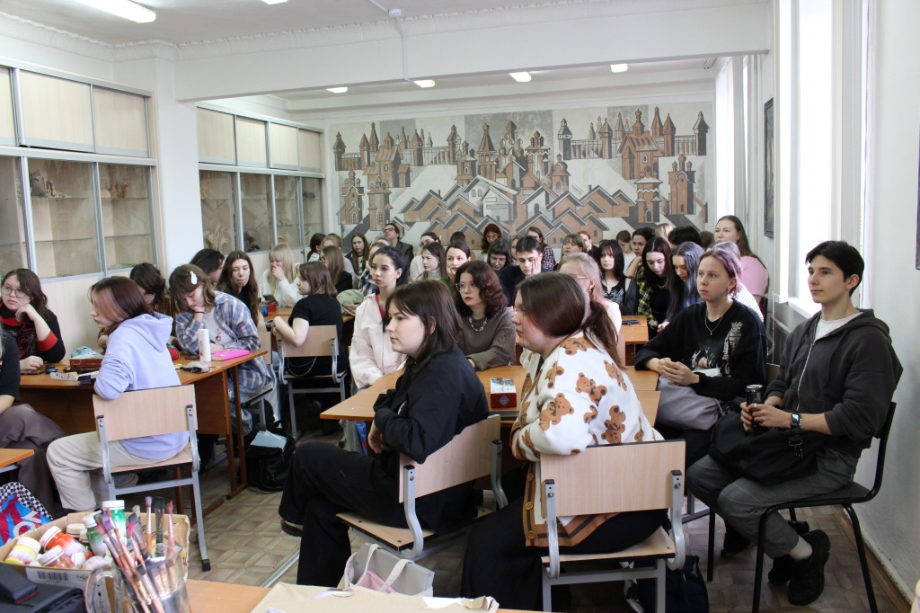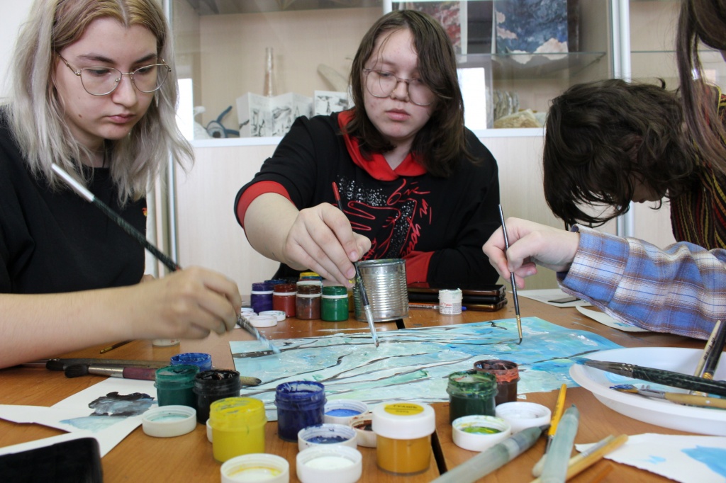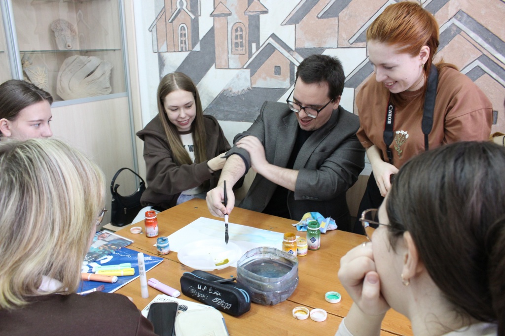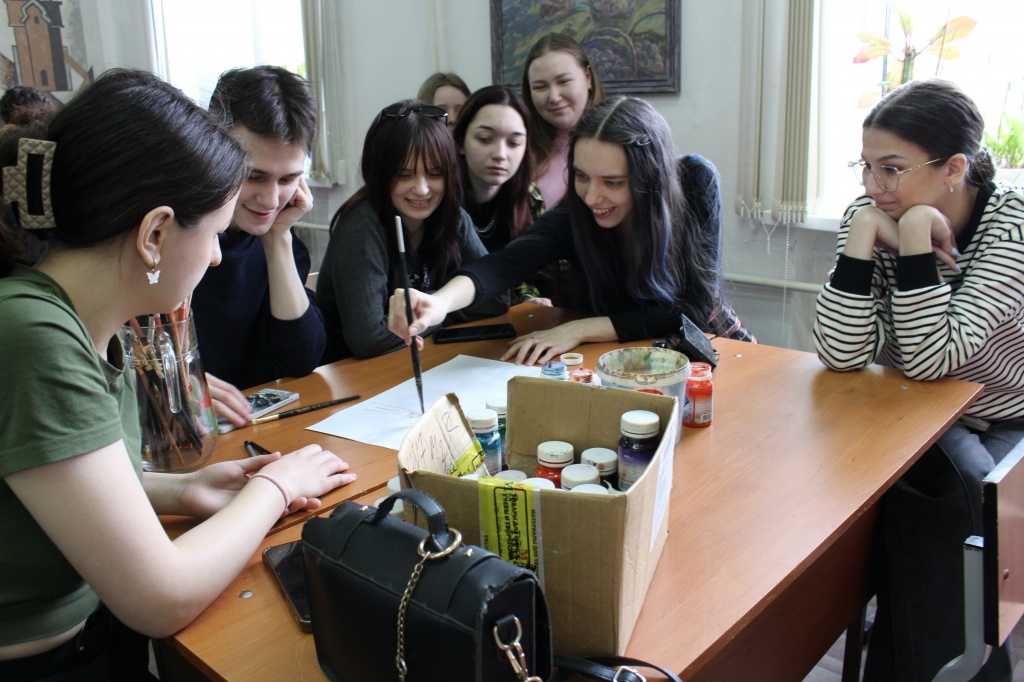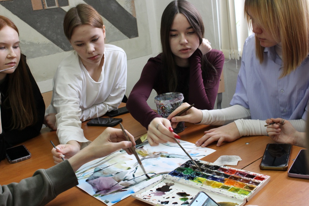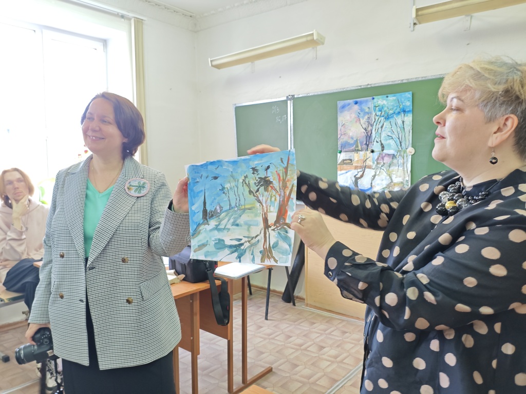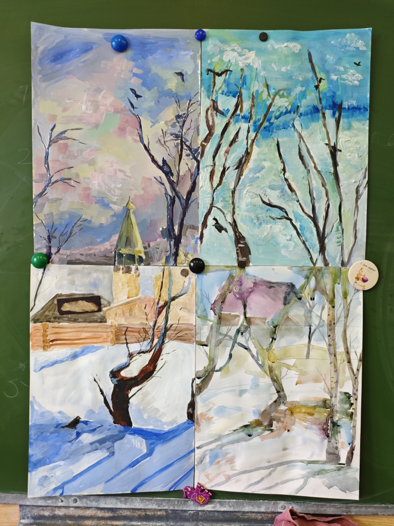 После разговора о деталях и художественных нюансах картины Саврасова со студентами был проведен практикум по составлению цветовой гаммы по мотивам картины. Итогом работы четырех студенческих групп стал коллаж, составленный по мотивам картины Саврасова.