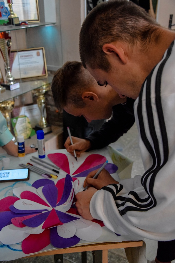 Традиционная акция была от представителей «Pro_Добро» – ромашка с пожеланиями. Все желающие подходили к столу объединения и писали на ромашке добрые пожелания и слова. В результате получилась очень большая и объемная ромашка с множеством приятных и добрых слов. В этот же день в объединение вступило много новых волонтеров, которых все рады приветствовать в своем дружном коллективе!
