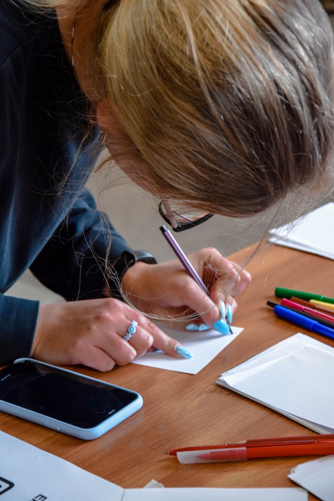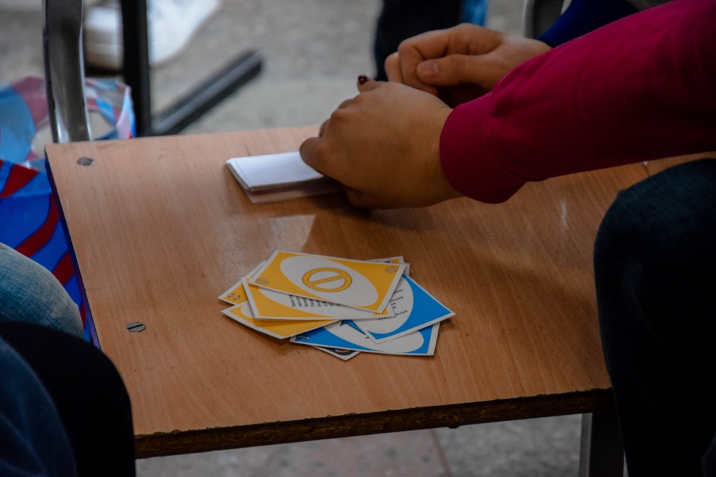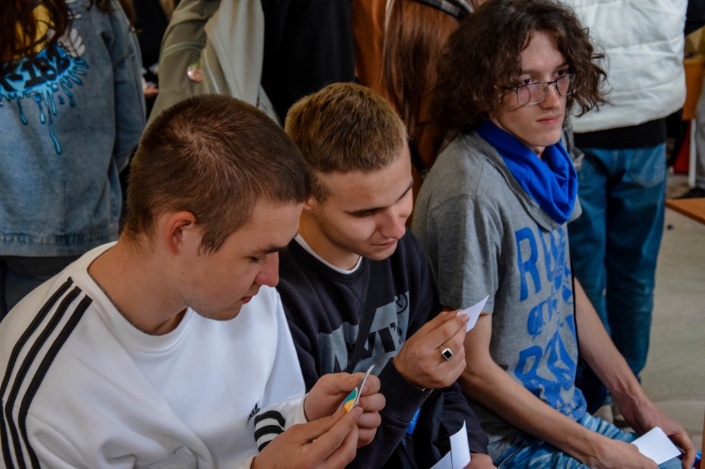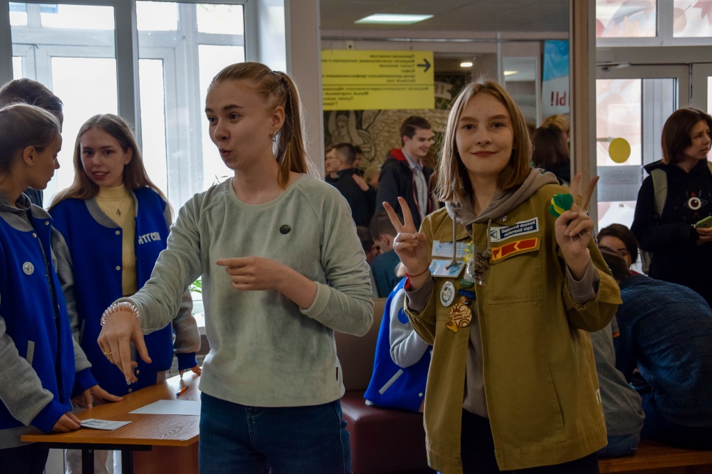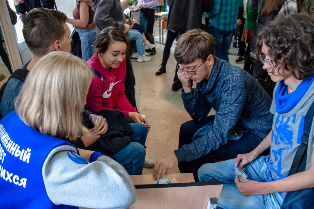 Студенческое объединение «Pro_Разум» предлагало учащимся сыграть в небольшую настольную игру, организовав пространство вокруг себя в виде круга, состоявшего из шести человек. Параллельно руководитель объединения и его активисты рассказывали обучающимся о своей работе в «Pro_Разуме»: как они создают игры, проводят мастер-классы, камерные и городские мероприятия.
