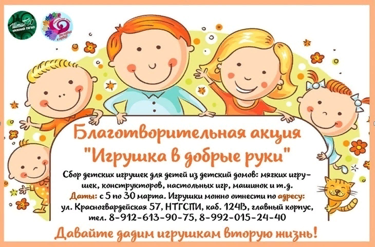 Штаб Студенческих отрядов совместно с Добровольческим центром «От сердца к сердцу» организовал акцию «Игрушка в добрые руки». Студенческие отряды и добровольческий центр провели сбор детских игрушек для ребят из детских домов и сами, конечно же, не остались в стороне! Каждый отряд сделал свой маленький вклад в такое большое дело! Большое спасибо всем отрядникам, студентам, добровольцам и другим жителям города, которые присоединились к акции и подарили радость детям!
