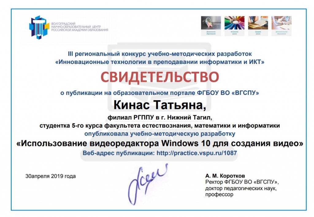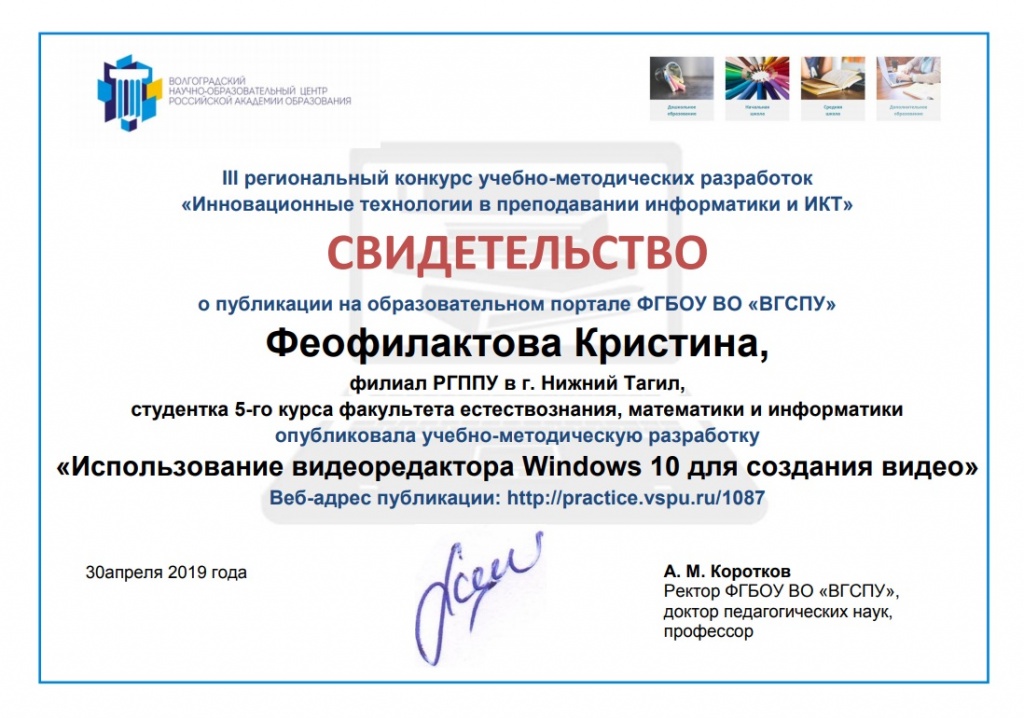 Студентки группы Нт-501о ИМ Татьяна Кинас и Кристина Феофилактова (руководитель Ирина Вячеславовна Беленкова) представили свою методическую разработку на тему «Использование видеоредактораWindows 10 для создания видео».