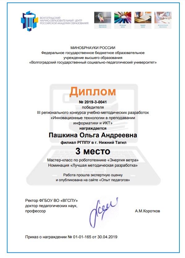 Студентка группы Нт-403о ПИЭ Ольга Пашкина (руководитель Дарья Михайловна Гребнева) поделилась своим опытом в организации внеучебной работы обучающихся в методической разработке «Мастер-класс по робототехнике «Энергия ветра». Мастер-класс был посвящен альтернативным источникам энергии и проведен на базе школы юного инженера «Экспонента». Работа была отмечена дипломом победителя за третье место в конкурсе.