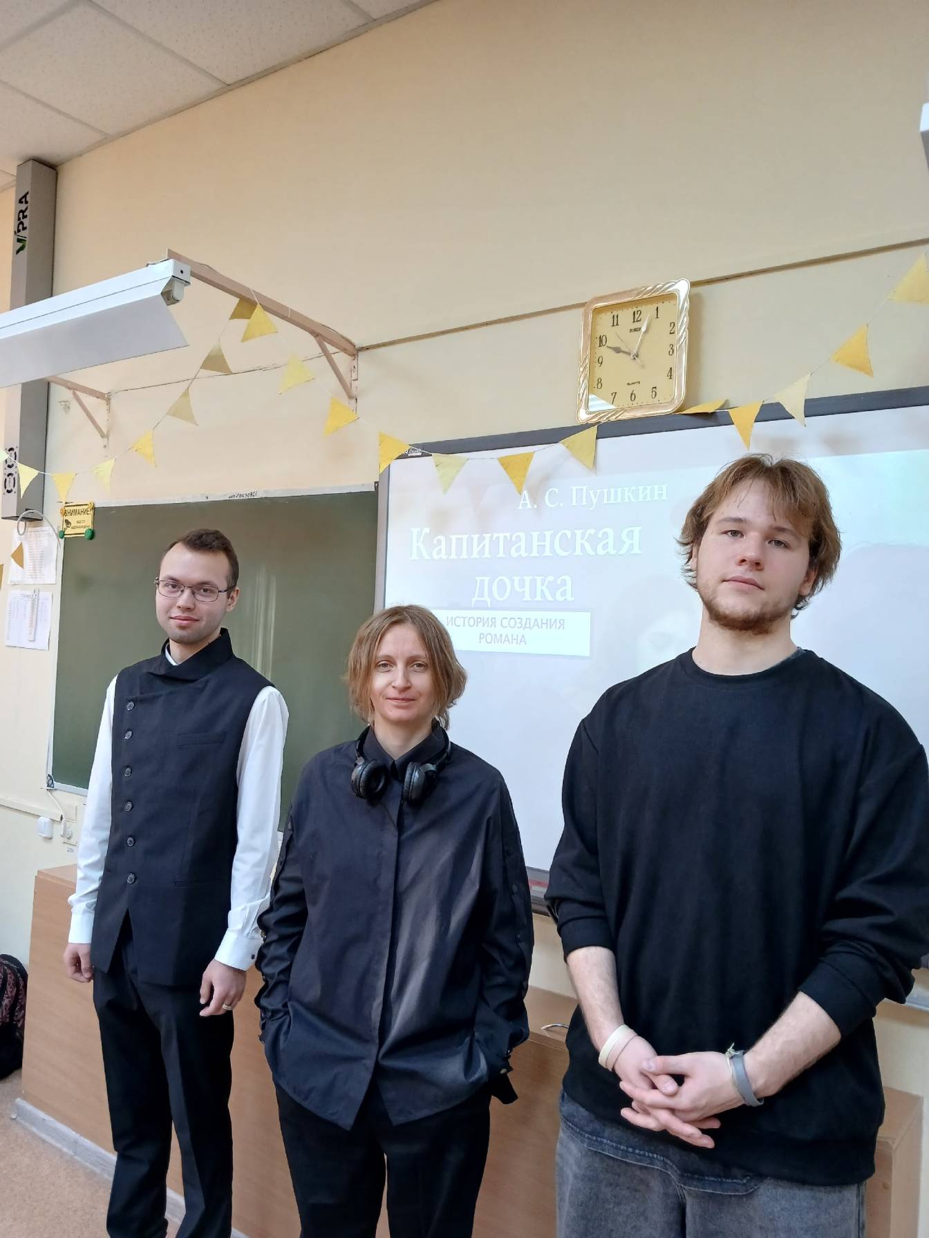 В течение 40 минут Даниил и Никита рассказали учащимся о том, какую задумку преследовал Александр Сергеевич Пушкин при создании романа, какими историческими источниками он пользовался и на что ему пришлось пойти, чтобы цензура разрешила напечатать роман.