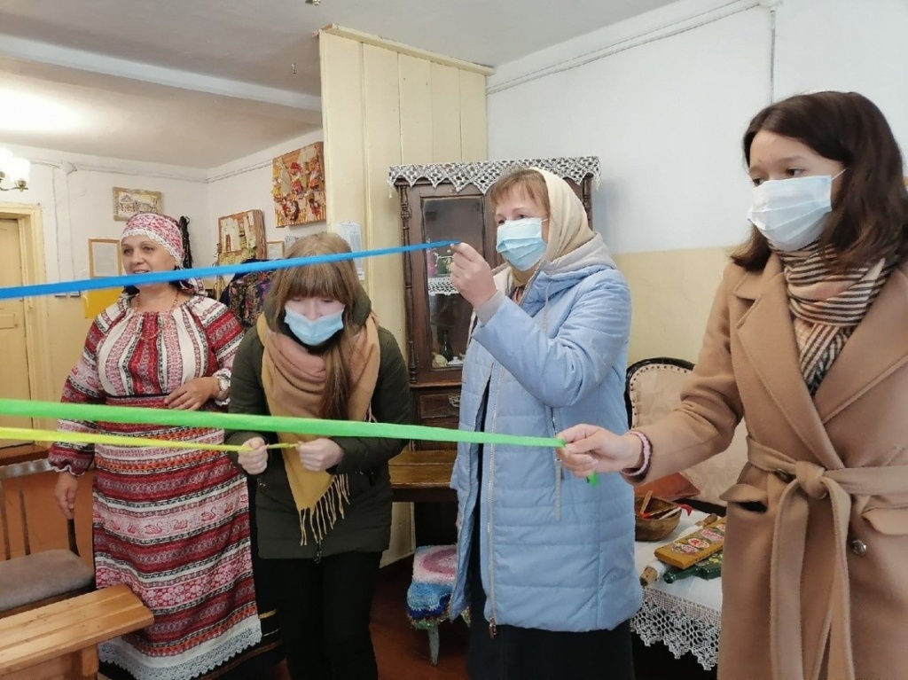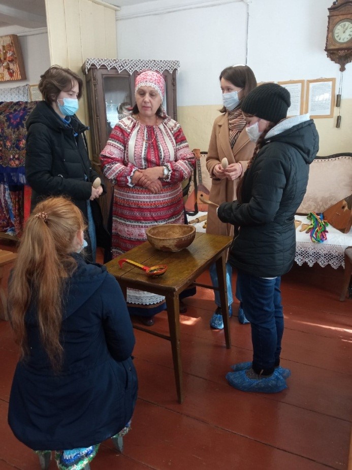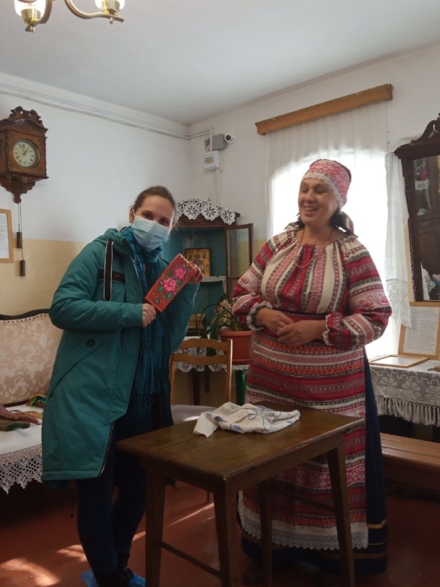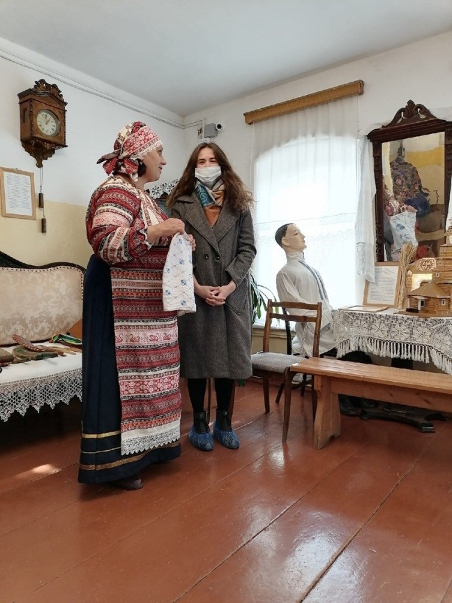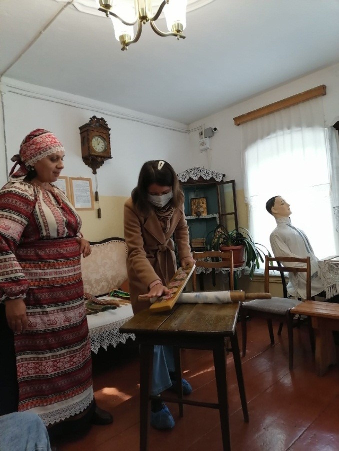 В гостевой комнате с традиционными строчеными занавесками и кружевными салфетками, резной мебелью, девушек-студенток познакомили в интерактивной форме с русскими бытовыми и культурными традициями. Побыть в роли «большухи», хозяйки дома: выбрать ложку для каждого члена семьи, прогладить белье катком, поклониться до земли, покружиться под балалайку – оказалось делом непростым. И за каждым действием – народная пословица, поговорка, примета с глубоким смыслом, раскрывающим характер. Так в быте одной семьи, в убранстве одного дома, как в зеркале, отразилась культура и традиции нашего народа. Дом наполнил нас своей светлой энергией.