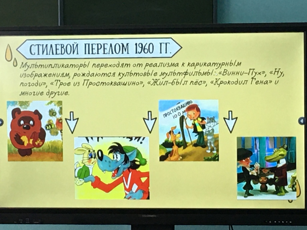 Особый интерес участников дискуссии вызвали следующие вопросы: влияние анимации Уолта Диснея, эволюция произведений студии Союзмультфильм, динамика изменения образа главного героя в советской мультипликации. Мы проверили аудиторию на знания мультфильмов в игровом формате: были представлены цитаты из разных произведений, песни, фрагменты и мемы, которые студенты создали сами. Конечно, самыми узнаваемыми стали примеры «золотого периода», связанного со стилевым переломом в развитии отечественной мультипликации. К такому периоду были отнесены 1960–1990 гг. При этом 1980–1990 гг. уже характеризовались сменой акцентов, которые определялись и новой эпохой, и изменениями технологий.